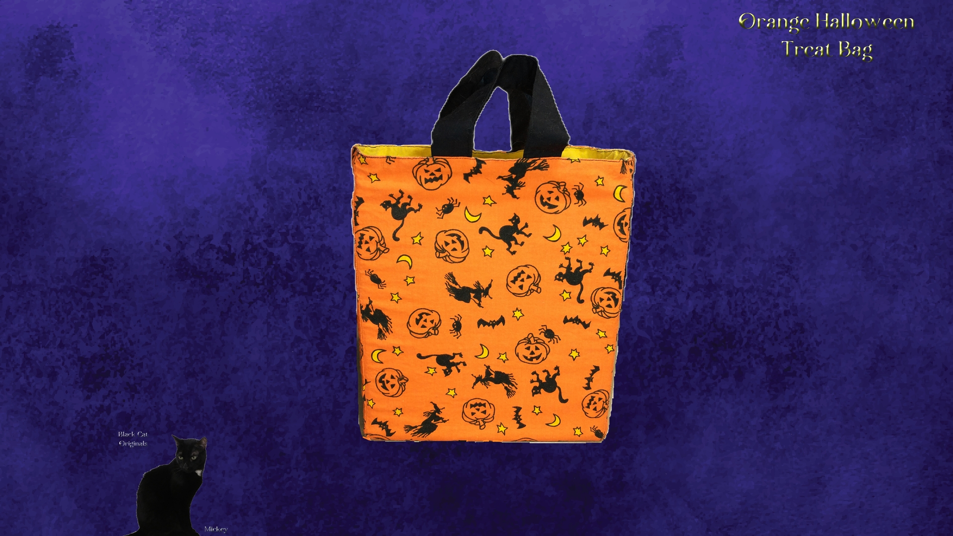 This is a small tote with a fun Halloween theme! It is 100% cotton except for the nylon handle and measures 11 inches tall by 9 inches wide and 4 inches deep. Just the right size for a night's worth of trick or treating. It's reusable, too! Machine wash/dry. Linings and handles vary. I have 2 with the solid narrow sides and one with the printed narrow sides. All have the printed wide panels (front and back).