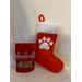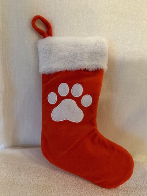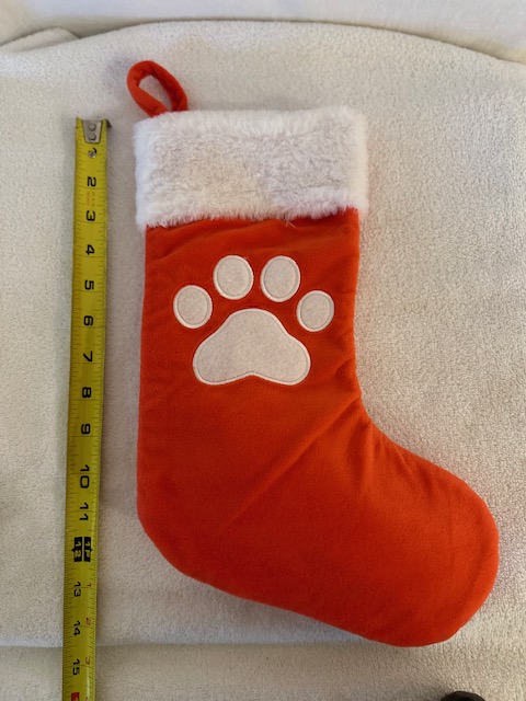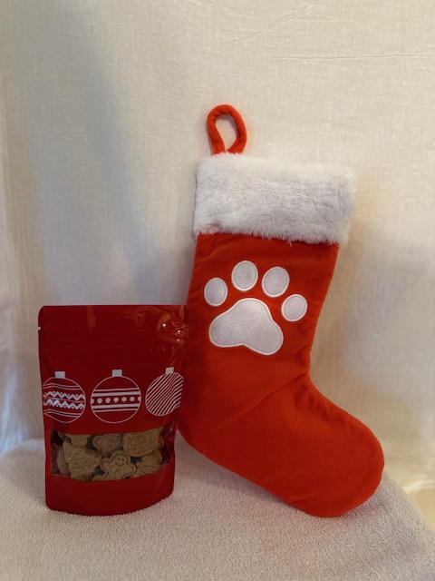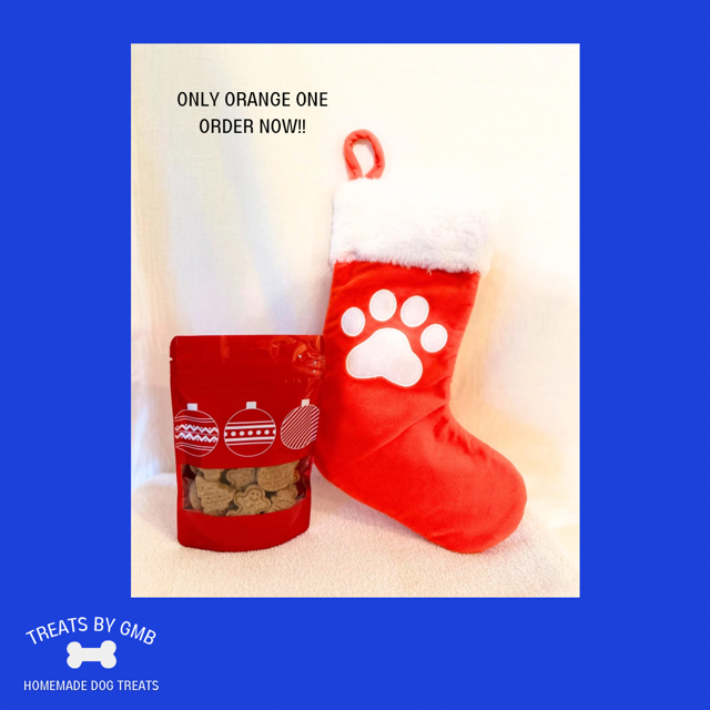 Only have 1 left - Kickoff the holidays by hanging your beloved pup's Stocking filled with homemade dog treats! This stocking is orange with a large white paw print. The stocking has a hang tag on it and at the longest point is about 14 inches tall. This cute dog stocking comes with your choice of Homemade Dog Treats! You can select the flavor of treats below. The Peanut Butter treats are made with whole wheat flour, peanut butter, eggs and honey. The pumpkin treats are made with whole wheat flour, 100% pumpkin puree, eggs, peanut butter and cinnamon. The Bacon, Egg and Cheese treats are made with Bacon, Egg, Cheese and Oat Flour. The Grain Free Gluten Free Treats are dairy free and made with 100%Pumpkin Puree, Coconut Flour, Cage Free Eggs, Turmeric, and Cinnamon. For all our products that contain cinnamon, we only use the cinnamon identified by Consumer Reports as the safest grocery store cinnamon brand.