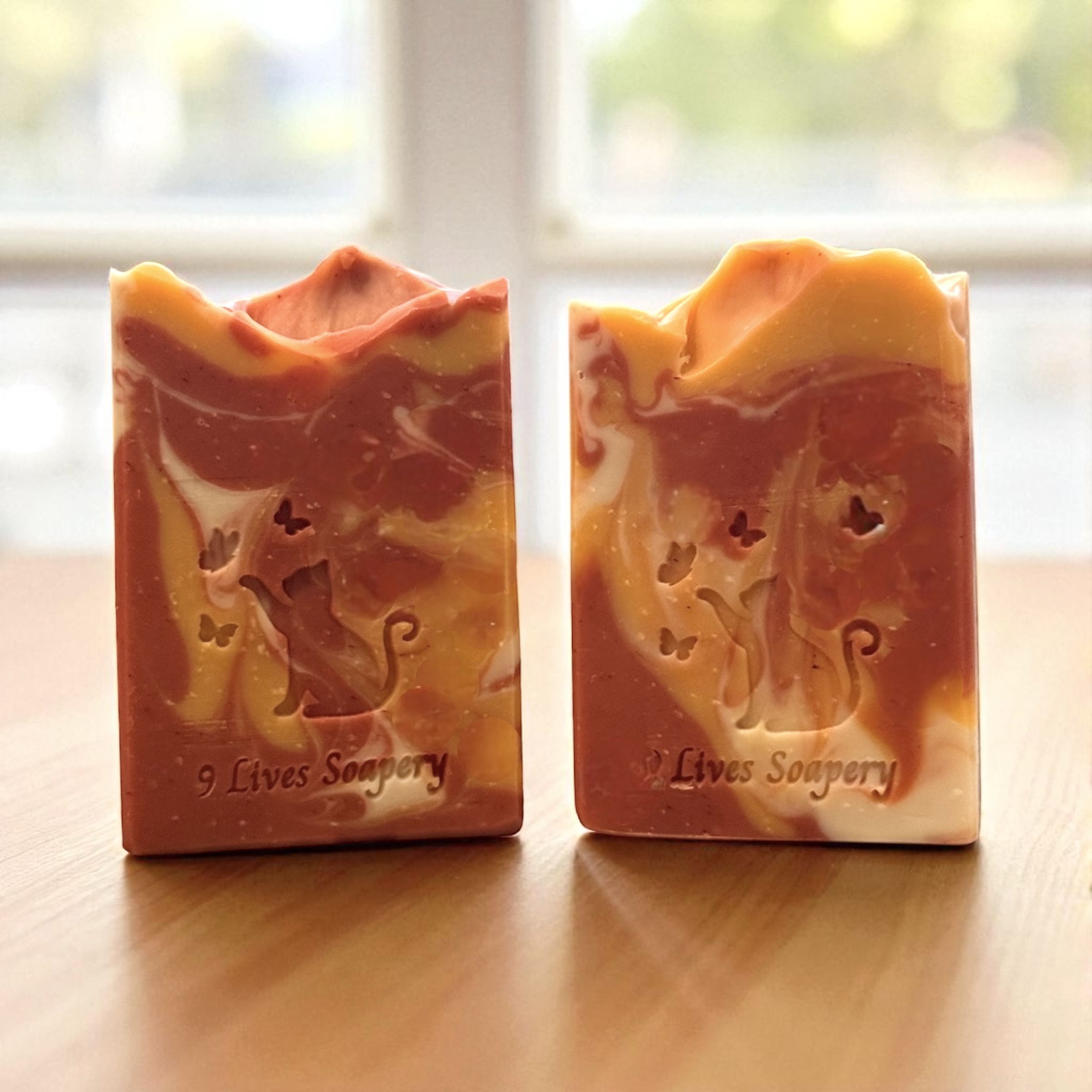 This soap is made using the cold process method. The oils and butters are melted and then mixed with the lye solution, and then the magic happens, saponification occurs! This is the chemical reaction between the lye and oils which creates soap. The batter is poured into molds and set on the shelf to harden and finish saponifying. After 24 - 48 hours, the soap is unmolded and cut, and then set on a shelf to cure for 4 - 6 weeks which allows the water to evaporate from the bar, creating a hard, long-lasting bar of soap.