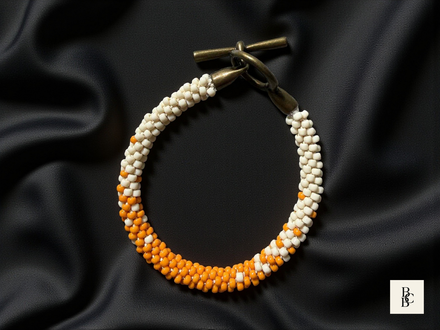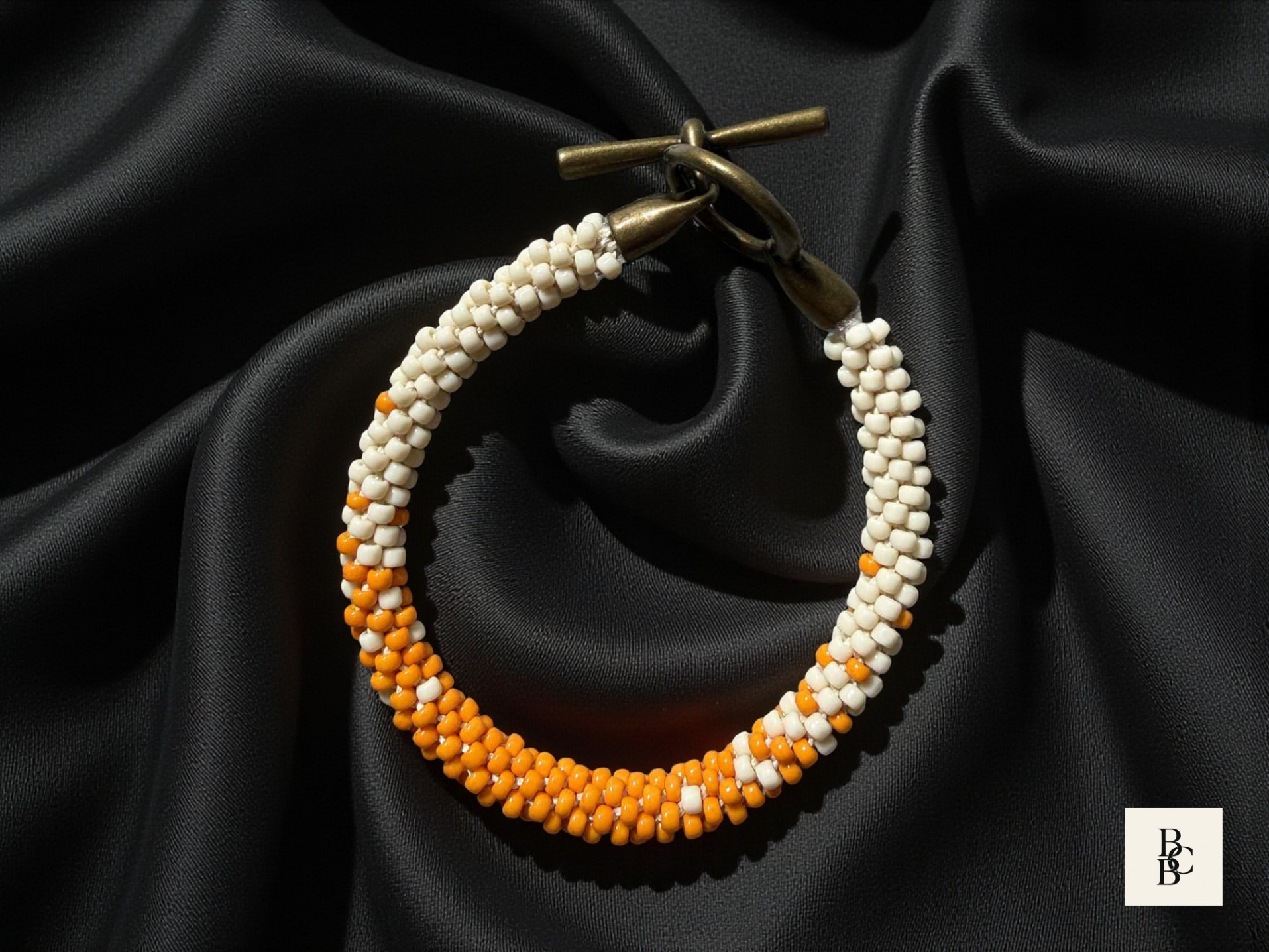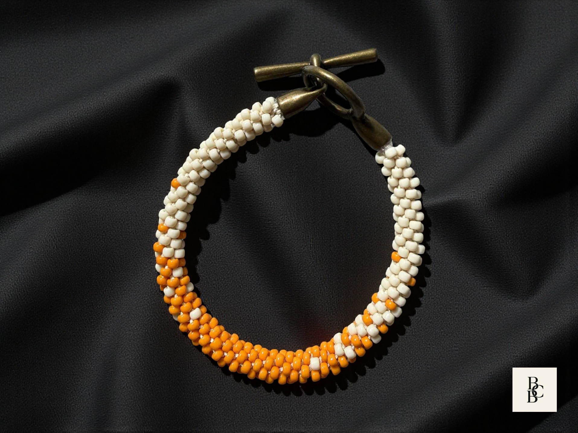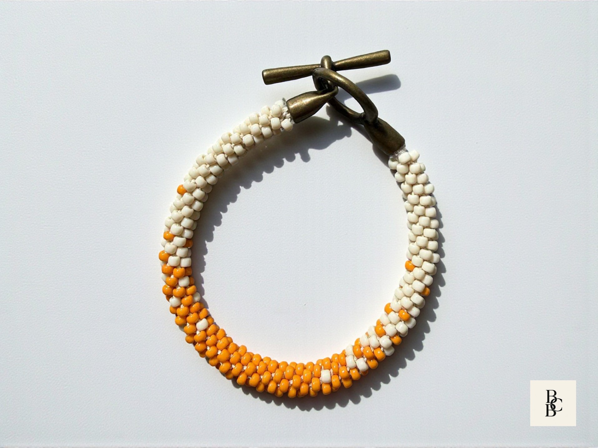 Each glass seed bead is carefully placed by hand to create a seamless, flowing design that transitions beautifully between warm citrus hues and soft neutral shades. The result is a unique handmade Kumihimo bracelet that feels playful yet refined. An antique brass toggle clasp completes the design, adding a timeless, vintage-inspired finish while ensuring secure wear.