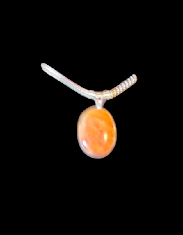 A petite pendant the size of a dime cut and polished from oyster shell and mounted in Sterling Silver. It is then mounted on an 18 inch Italian made sterling silver box chain.