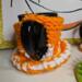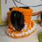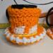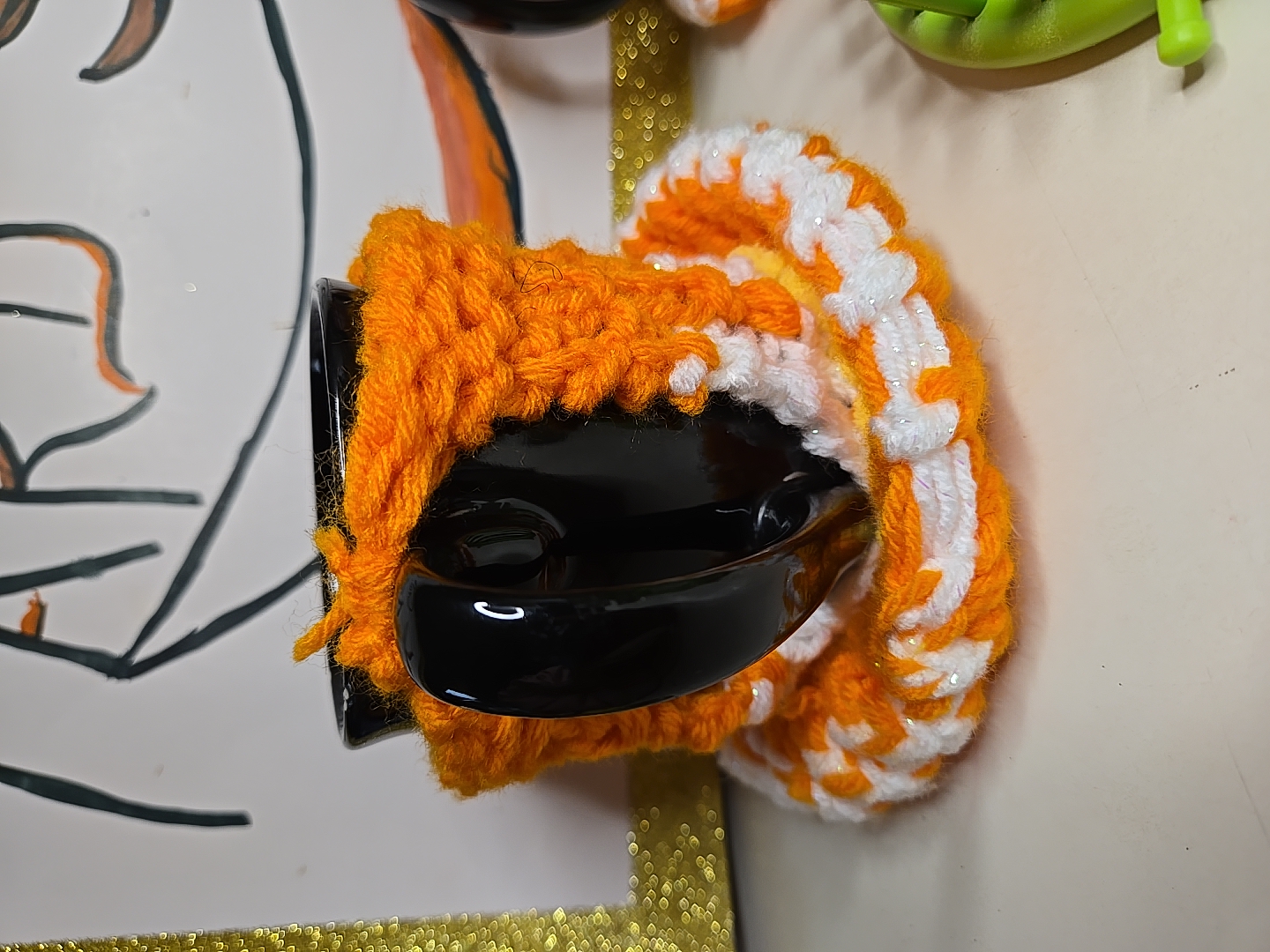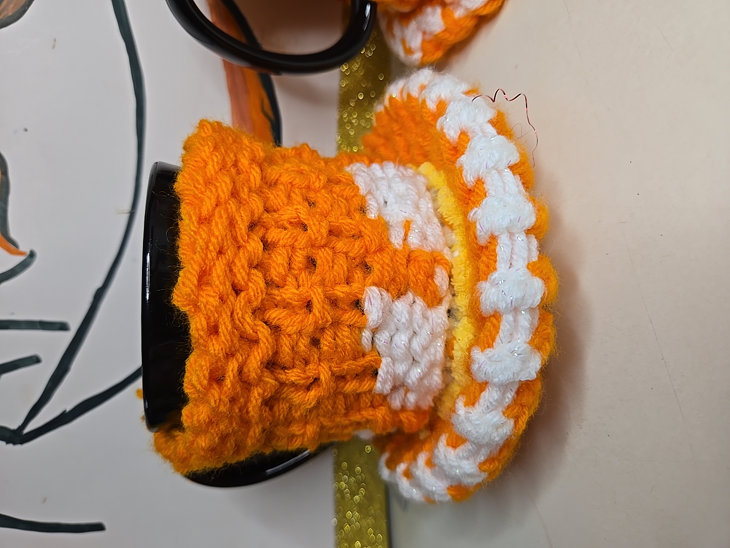 Cozy up your cup with these out of the box designer cup holders. Bottom of cup cozie to hold your cup and keep drinks like hot cocoa warm while you sip it. Cup cozies keep your hands from getting burned. 100% orange and white polyester yarn