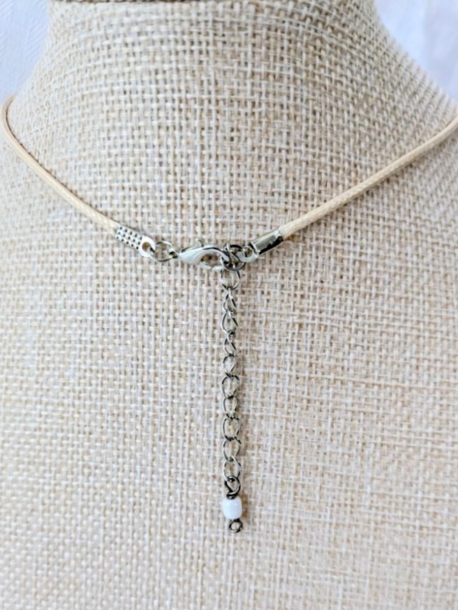 The leather cord is approximately 17" long with a 2" extender, finished with a glass seed bead.