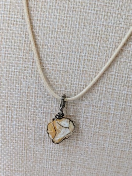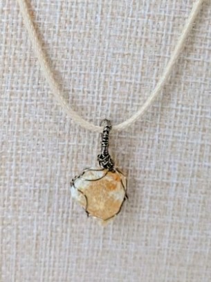 Embellished with wire wrapping on the stone and on the bail. This piece can be worn with either side of the Agate facing forward.
