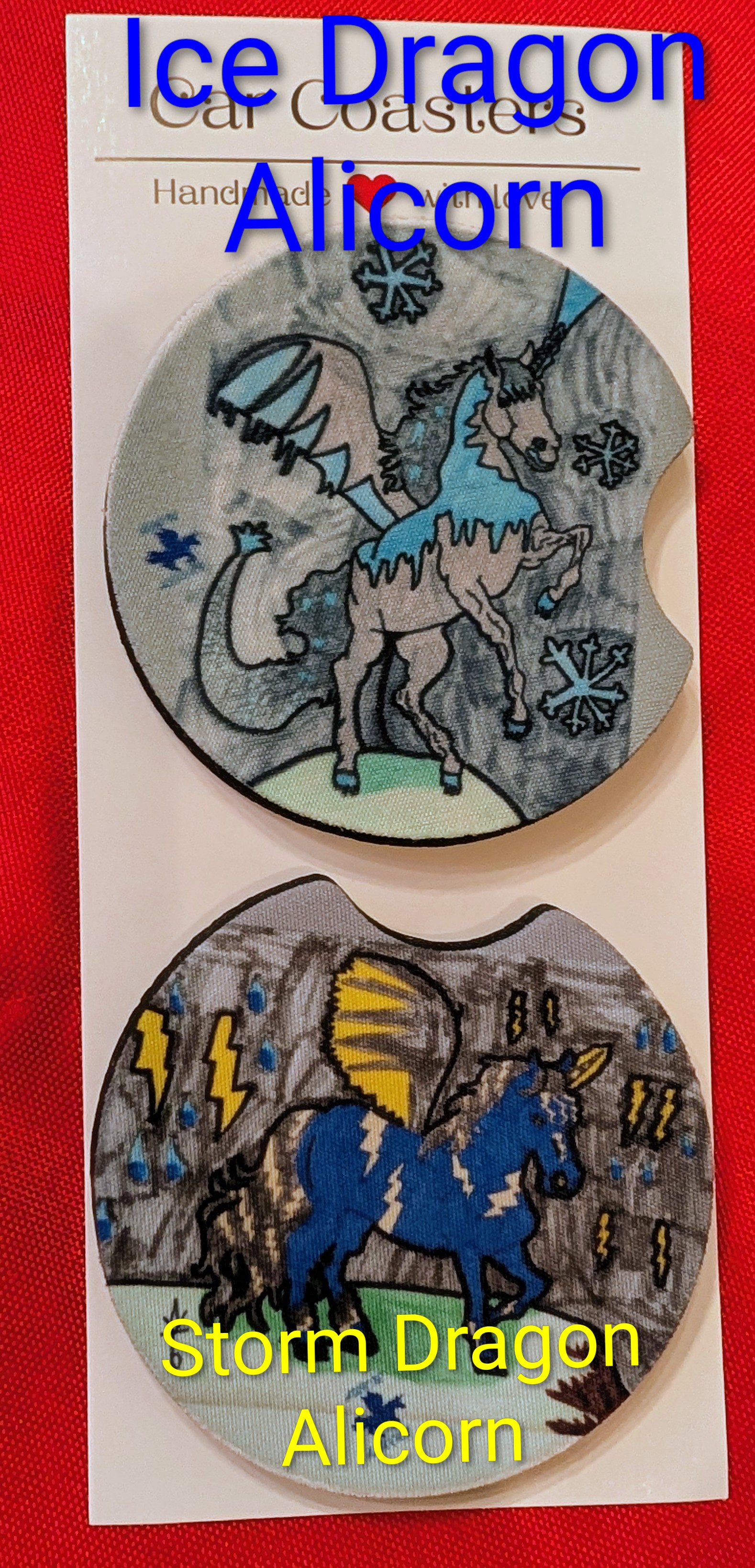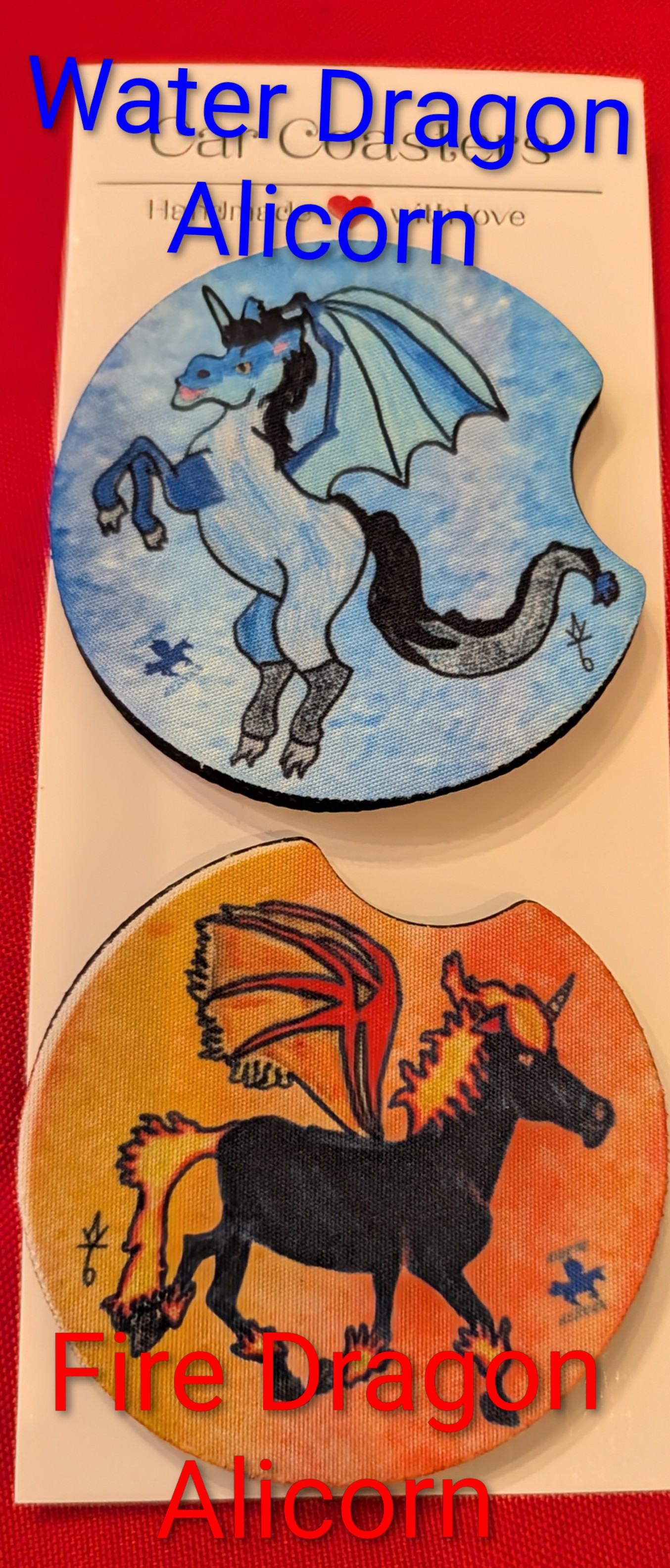 What is a car coaster? It's a small coaster designed to sit in the bottom of your car's drink wells to absorb moisture. Ours come in sets of two and are approximately 2.75 inch round neoprene with a notch for easy removal. They feature original Ausome Alicorn art and designs. I offer several different designs so make sure to check out all the options and select from the drop down when ordering. You can choose from combinations of two different designs or two of the same design. If you don't see a combination you'd like, please message us. Since these are made to order, the pictured items are representations and may not be the actual item you receive.