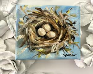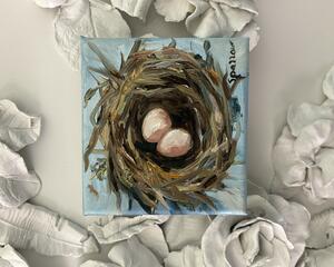 This exquisite miniature oil painting features a bird's nest cradling four delicate eggs—a poignant symbol of abundance, love, and the nurturing spirit of motherhood. Perfectly sized to fit anywhere, this piece can be displayed on a shelf, tabletop, or even hung on a wall to add a touch of warmth and meaning to any space.