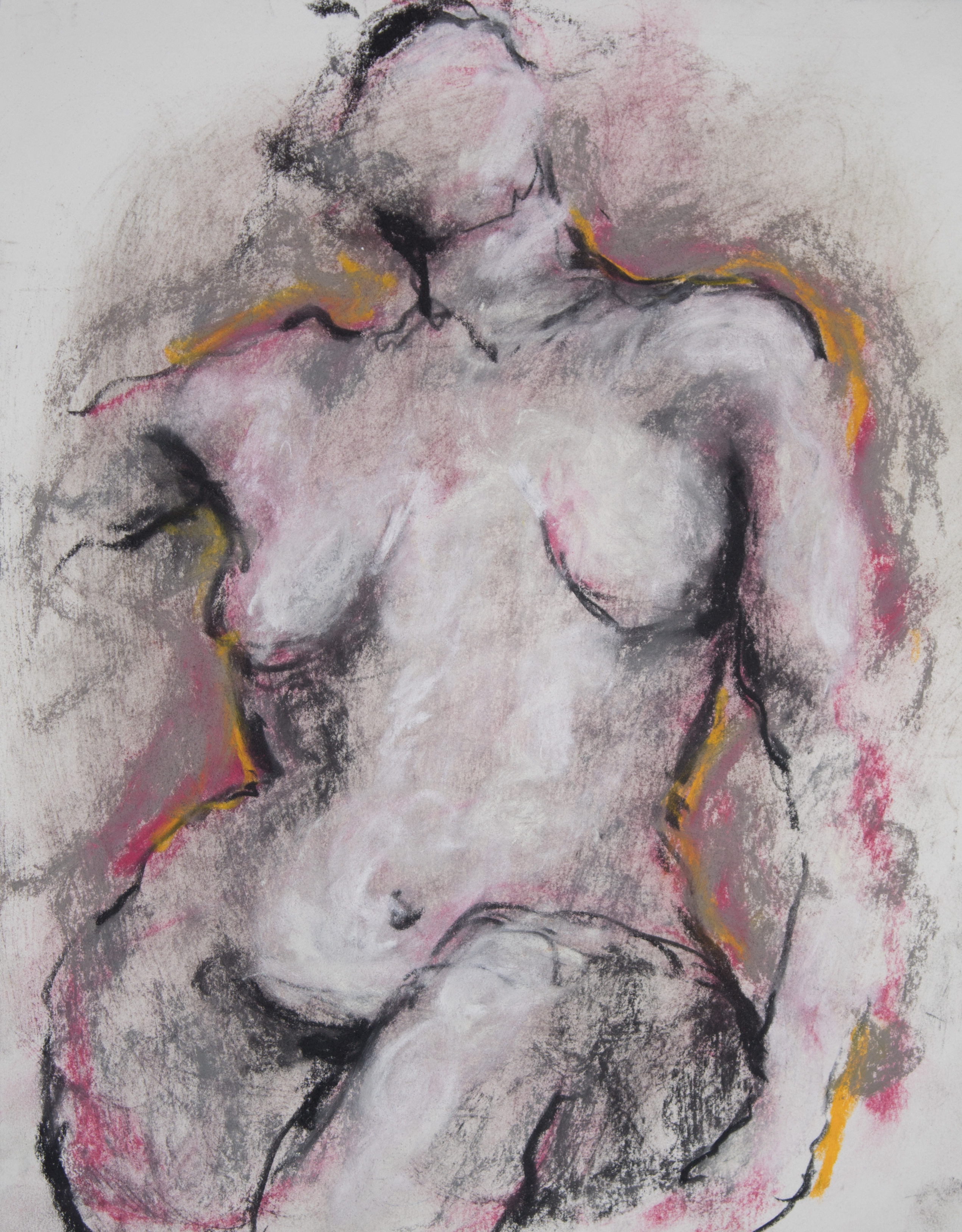 Drawing is of nude female done in charcoal and pastel on white drawing paper.