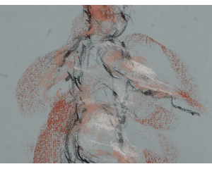 I nearly always start my drawings with a thick outline of the figure and then wipe vigorously to create a mid-tone. I then refine the lines with charcoal and use various pastel colors to add shadow and highlights and finish with another line of bright colored pastel pencil.