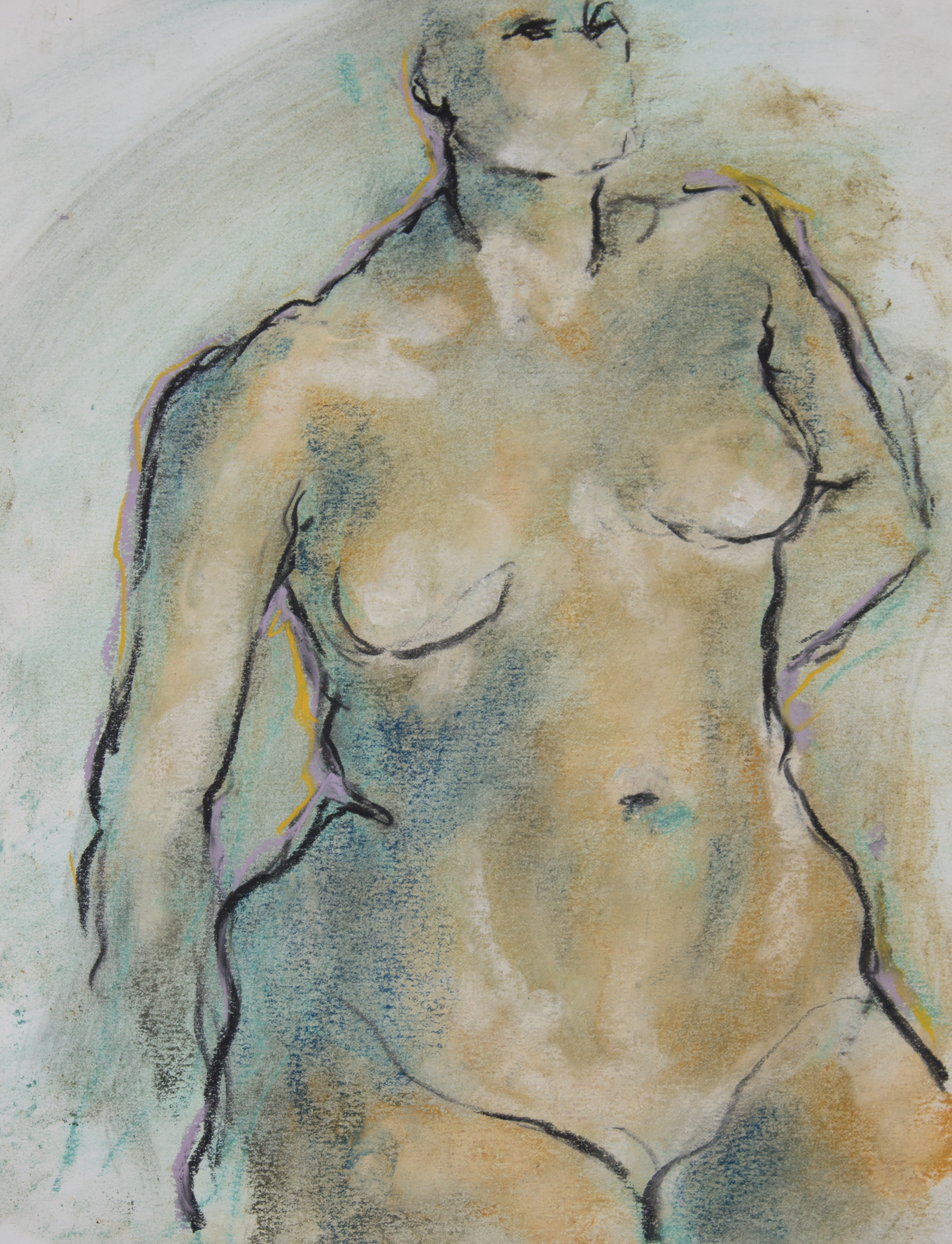 Drawing is of nude female done in charcoal and pastel on white drawing paper.
