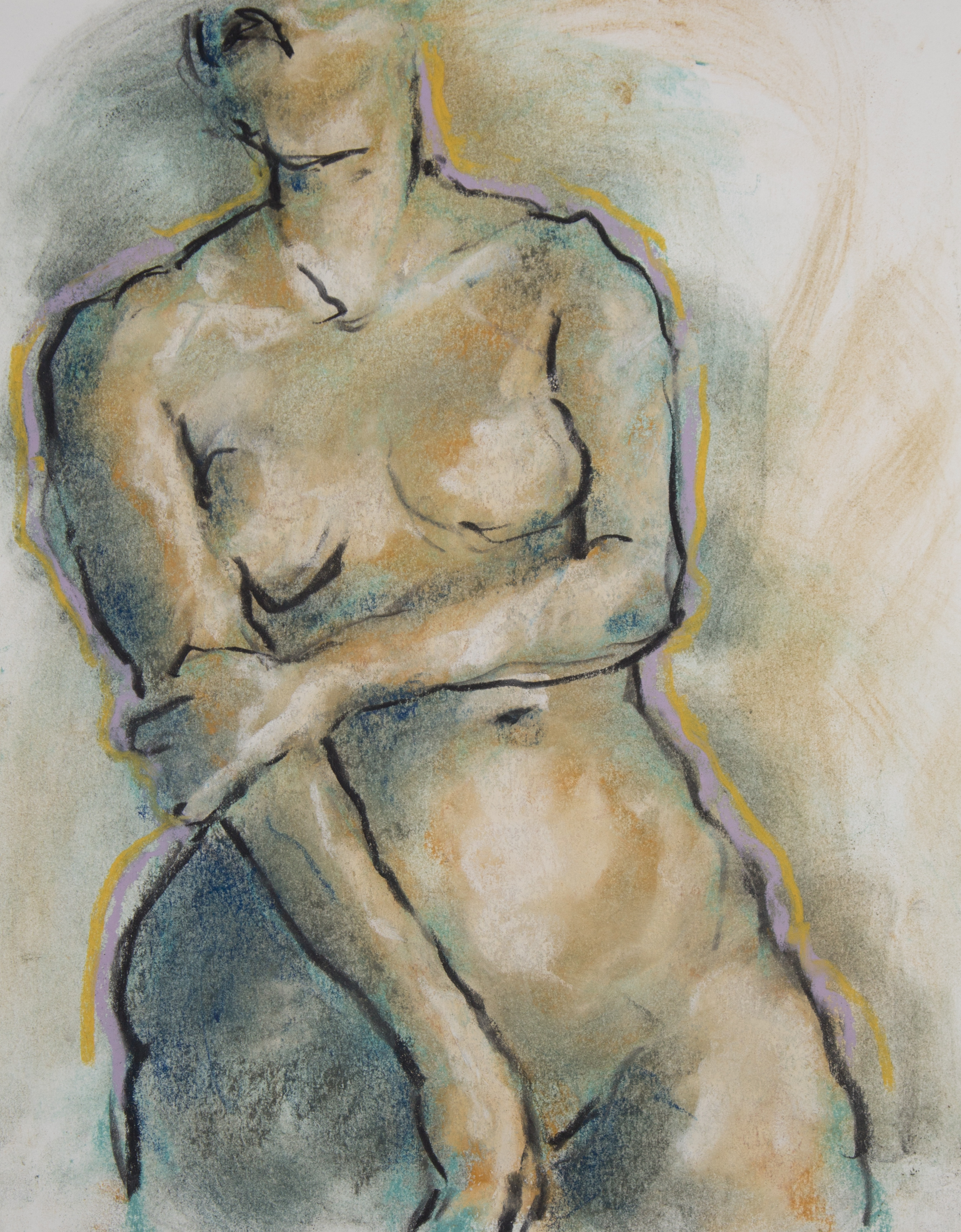 Drawing is of nude female done in charcoal and pastel on white drawing paper.