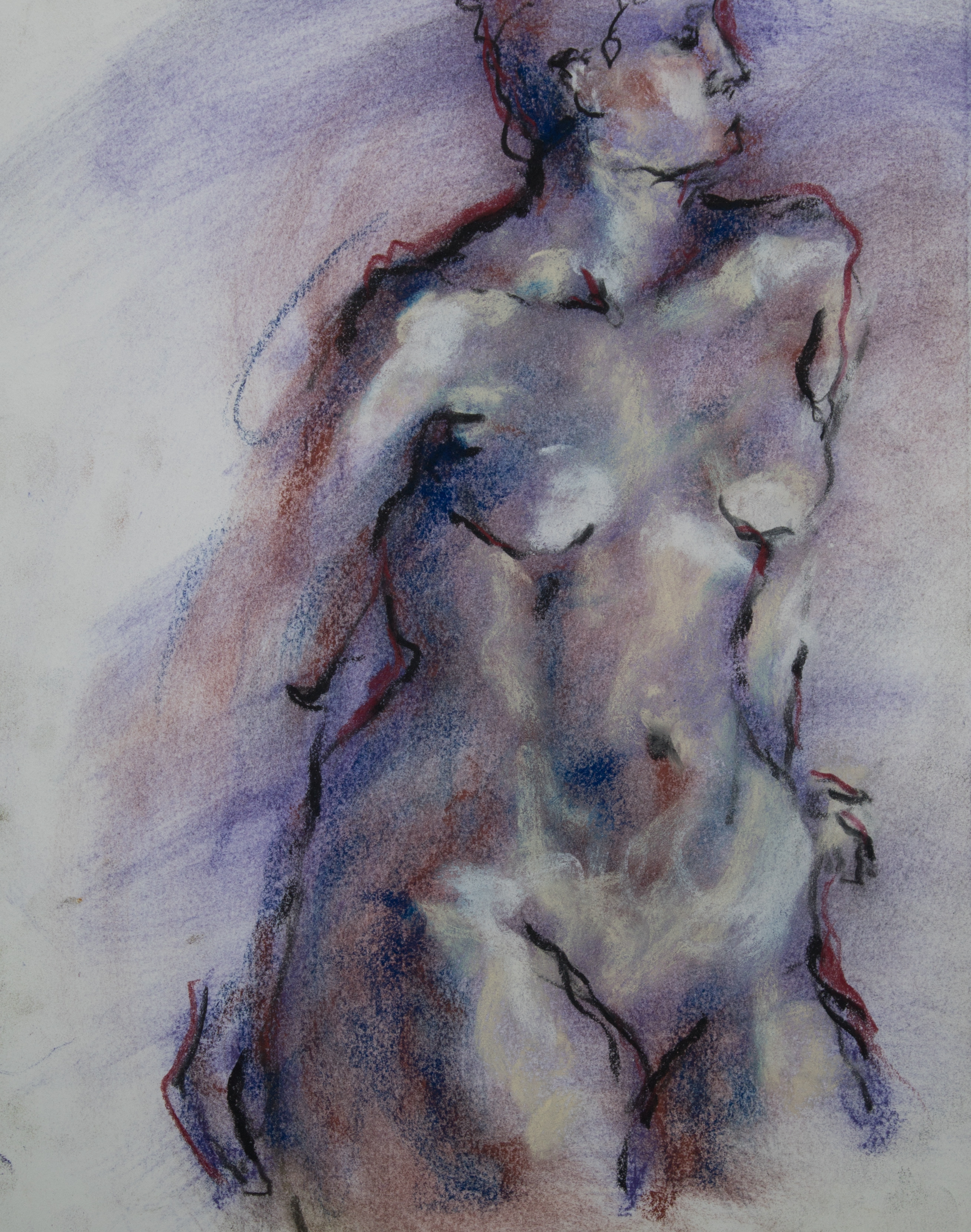 Drawing is of nude female done in charcoal and pastel on white drawing paper.