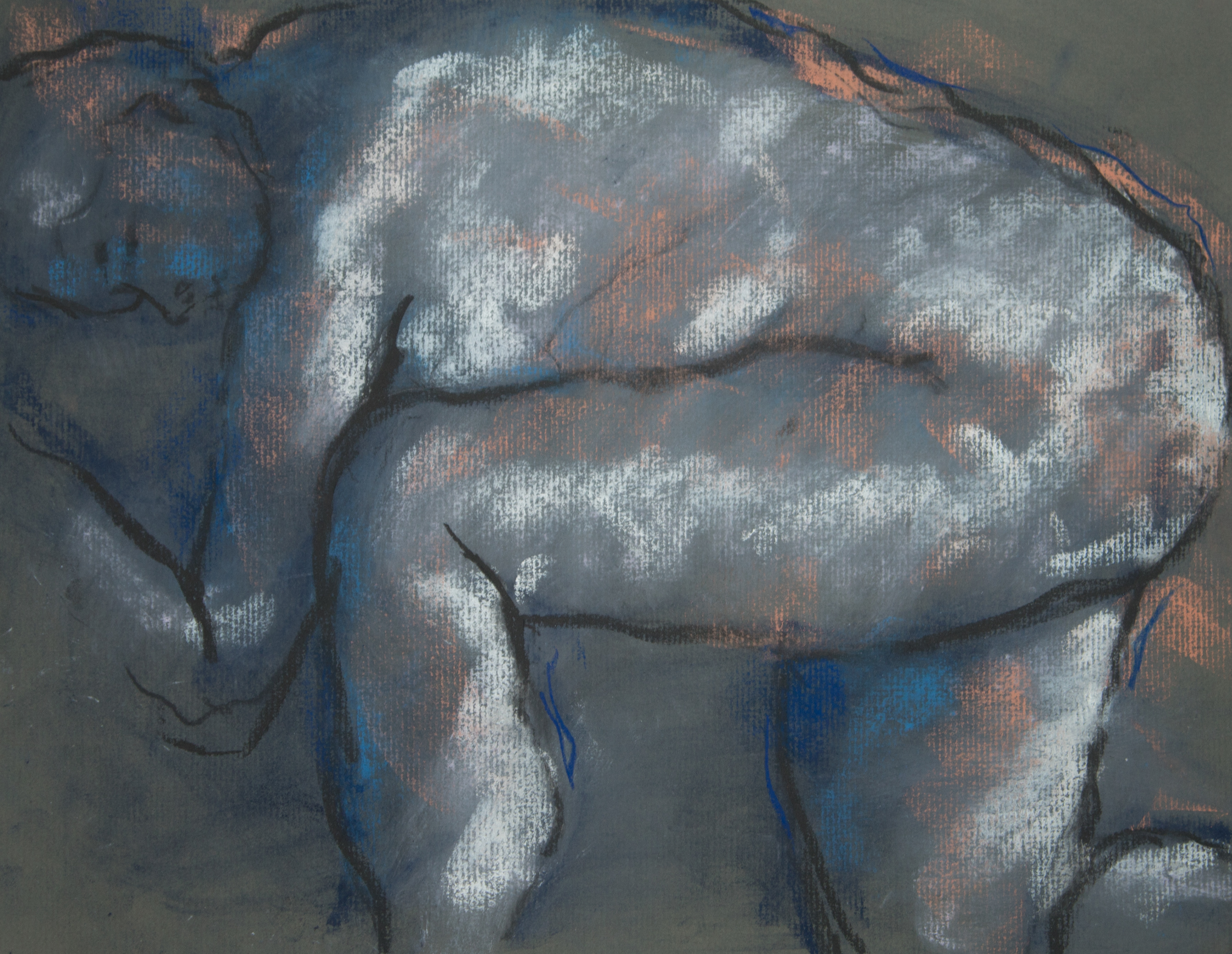 Drawing is of nude female done in charcoal and pastel on gray drawing paper.