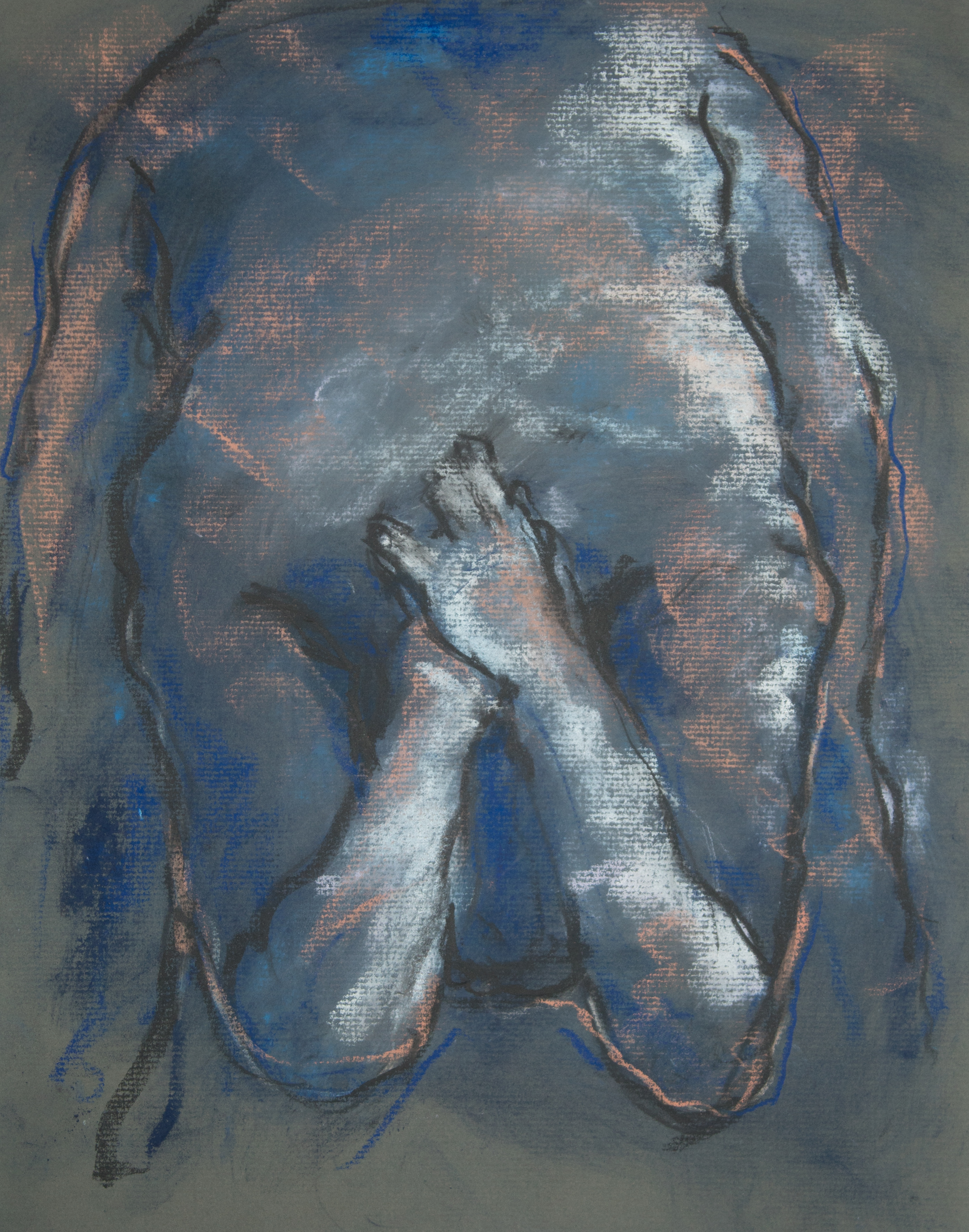 Drawing is of nude female done in charcoal and pastel on gray drawing paper.