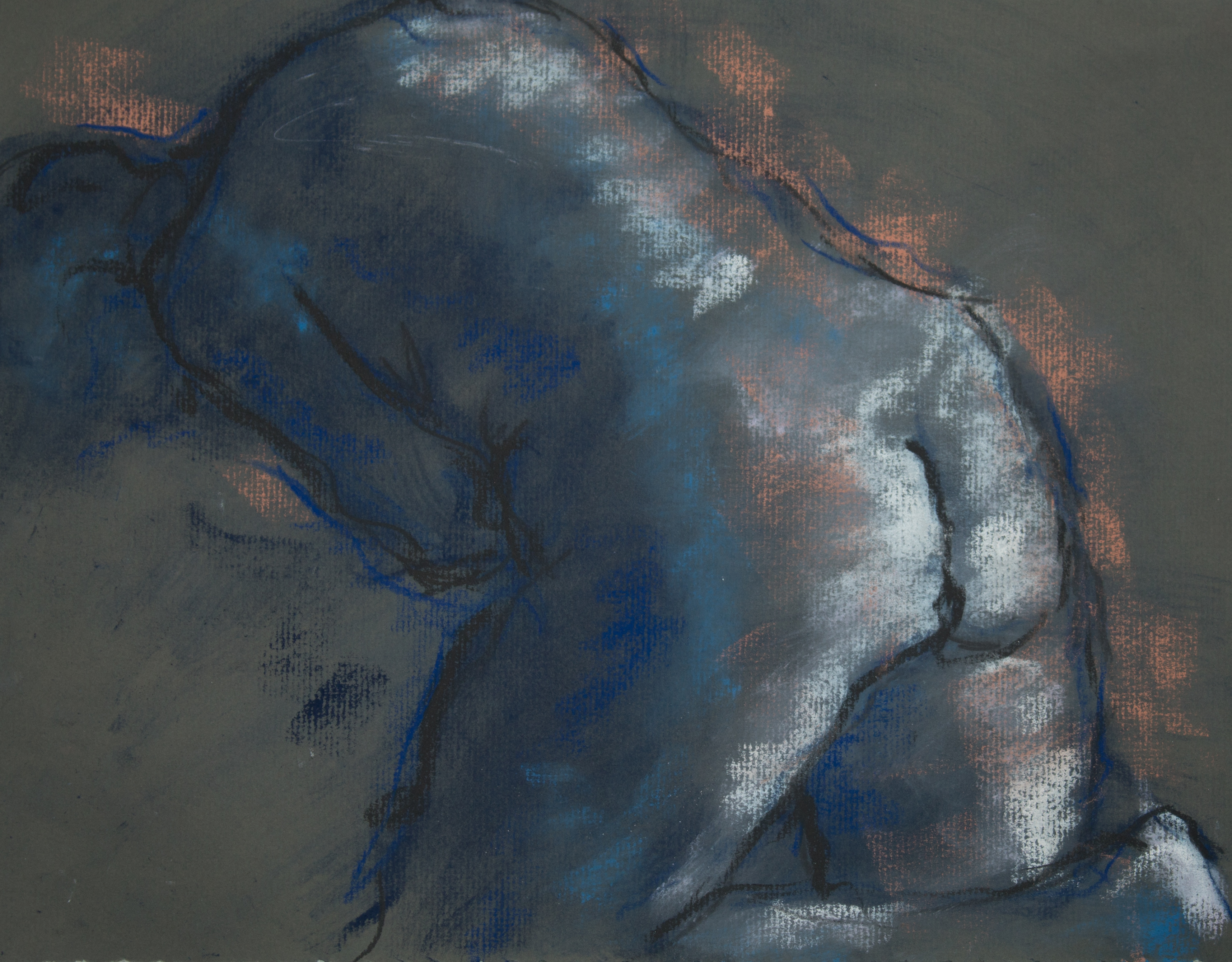 Drawing is of nude female done in charcoal and pastel on gray drawing paper.