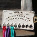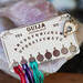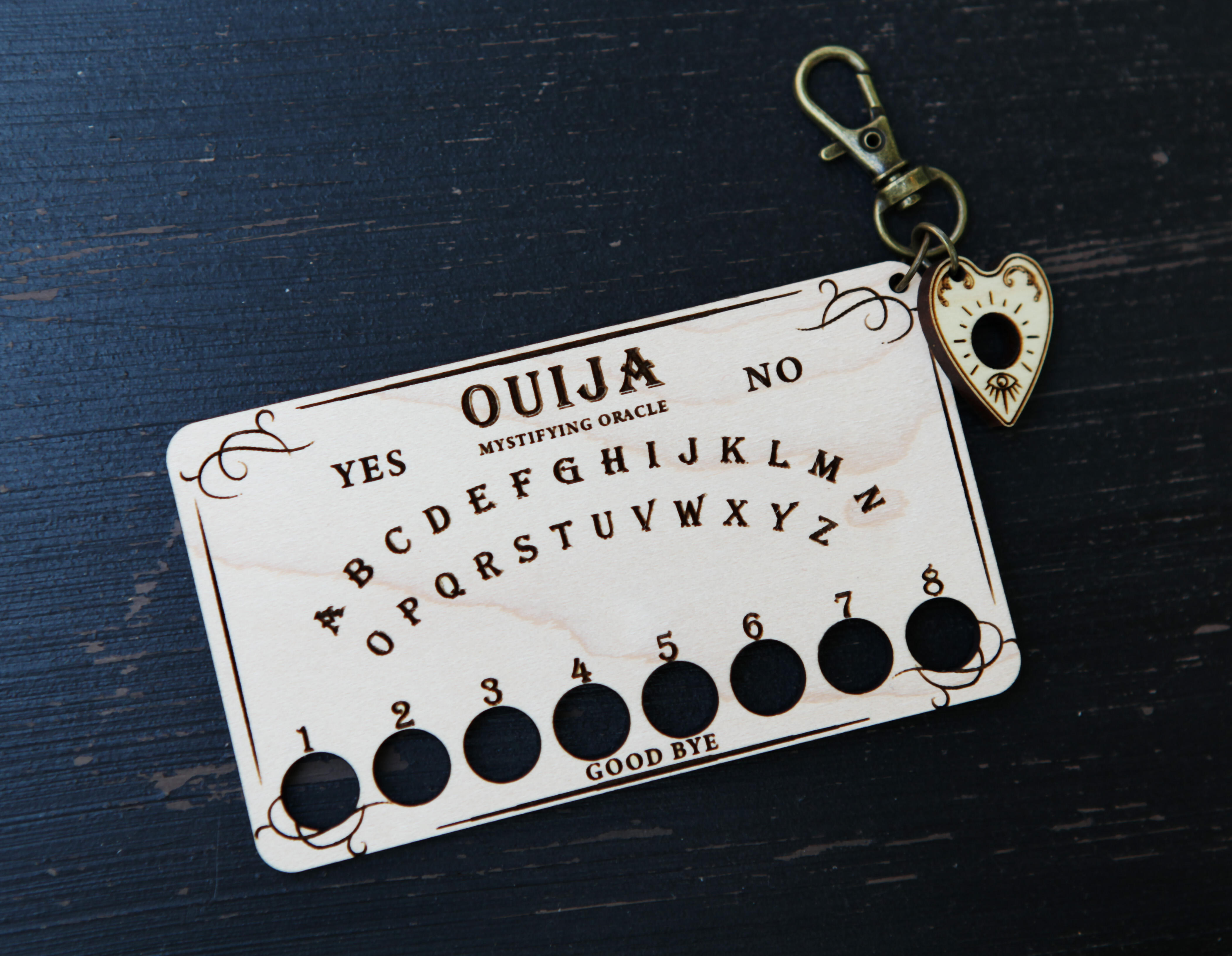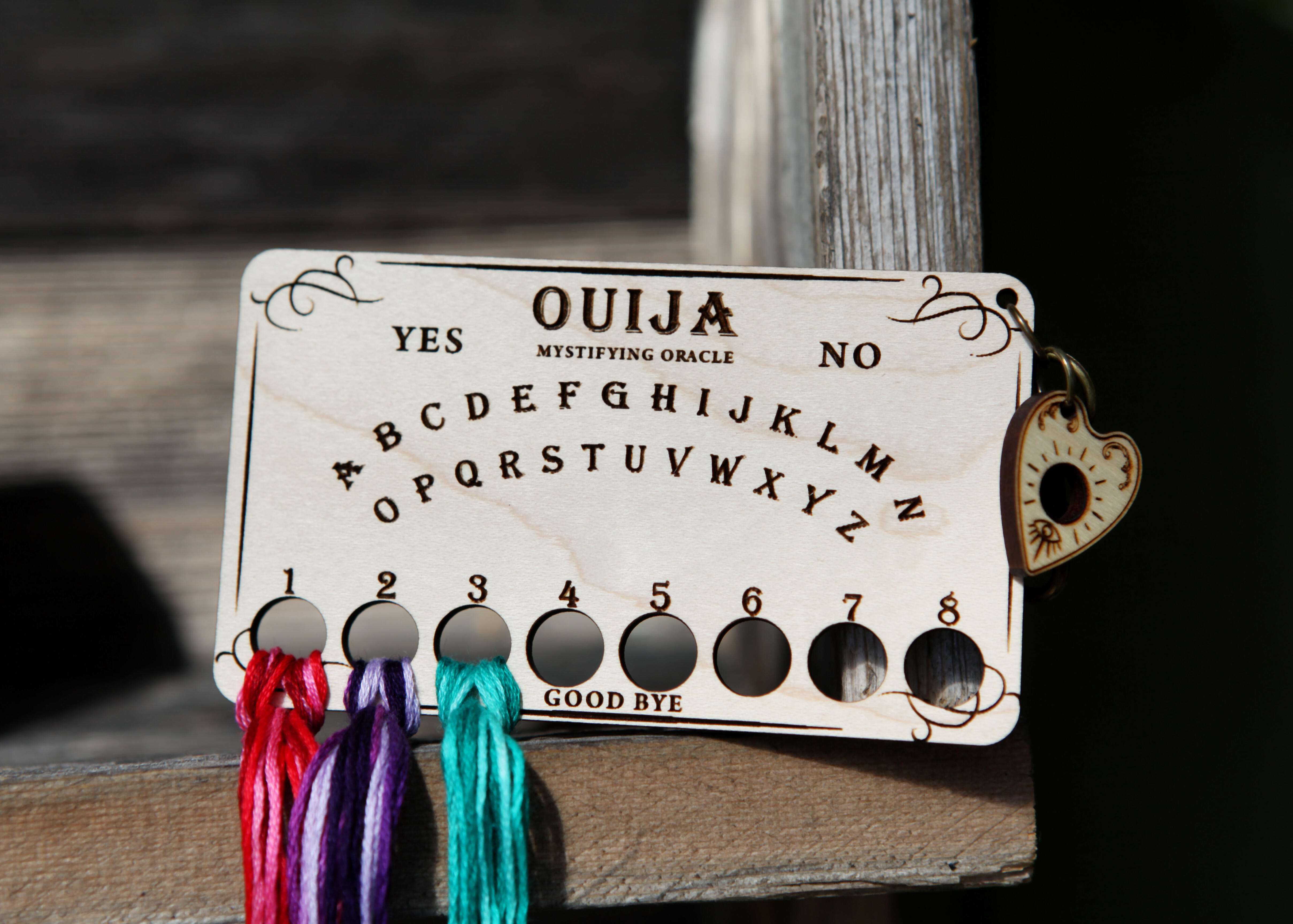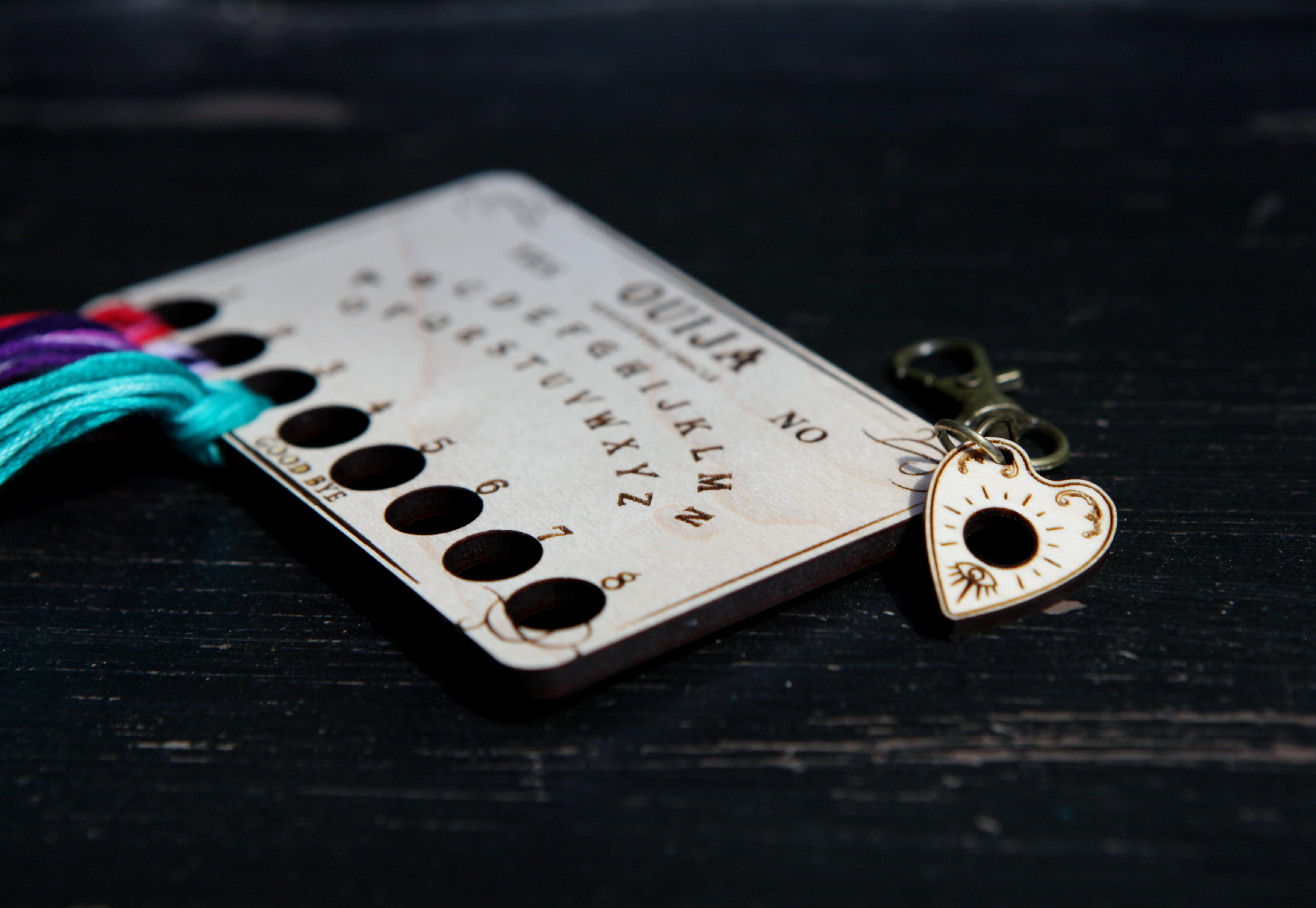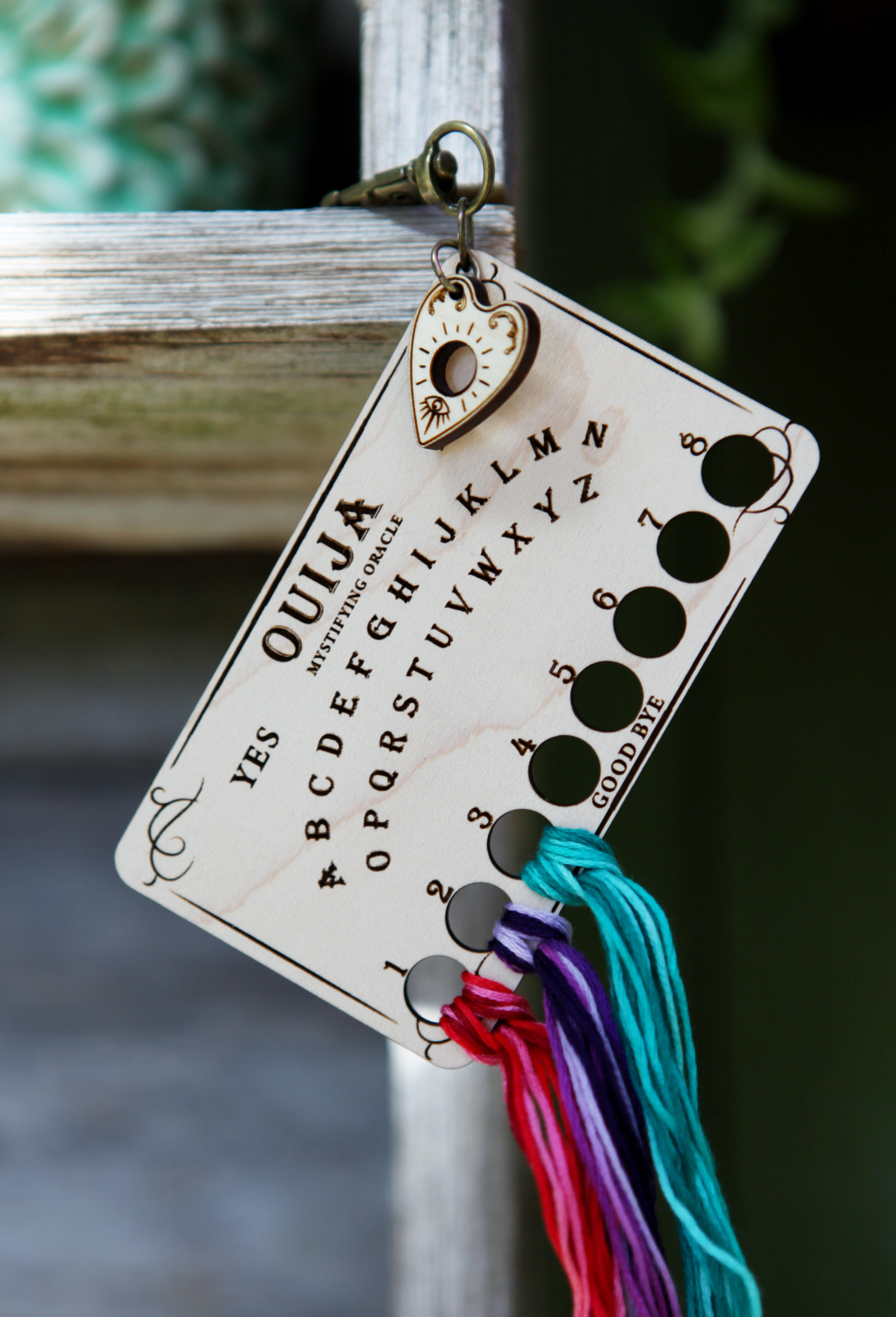 Embroidery floss organizer made from maple wood. This Ouija Board with planchette needlepoint thread holder has 8 circles to keep your yarn organized (or for supernatural communication) and has a clasp at the end to hook onto your cross stitch bag for easy access. Great for anybody who likes to hold seances and talk to those in the afterlife. This spirit board makes a great oddities gift.