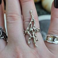 Each piece is carved, melted, dripped, and sculpted one at a time by me using jeweler's wax. The wax is then made into a mold and then melted out by pouring molten metal into the mold creating a rough cast of the piece. I then hand polish, nurture, set stones, and occasionally decide what enchantments I think the piece would have. It's been fun musing with my friends and family what kind of magic we would imagine some of these pieces to hold. ♥