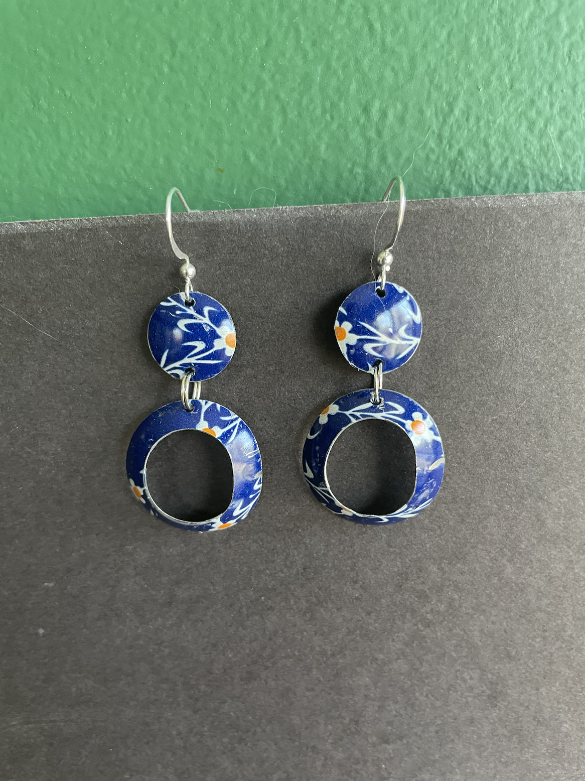 Tins are very light making them ideal for earrings as they don't weigh down your ears as the day goes on. Did you know the proper term for working with tin is "tinkering"? That made me really happy. I literally tinker in my art studio! I use old cookie tins, tea tins, and the like, break them down, and hand cut them into shapes and hand-hammer them into the 3-D shape I want them to be, finish and polish them, before putting them together like any other jewelry.