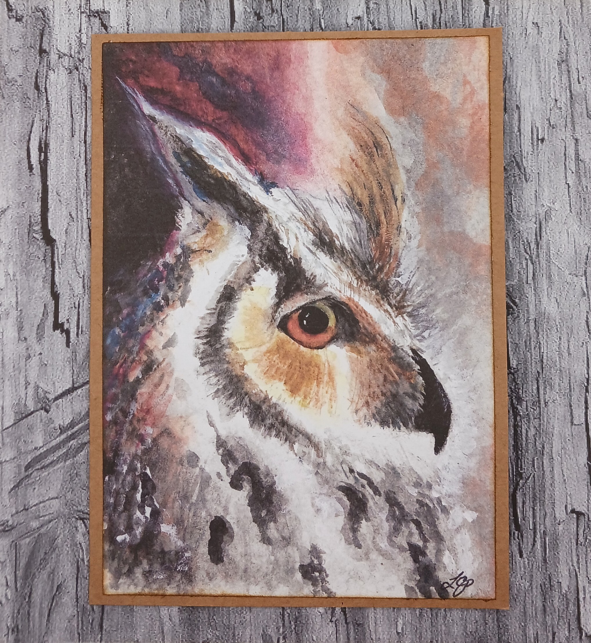 This card I made is a print of a watercolor I did. I love watercolors and keep at it to find my style. Love owls too! The print is on a 5" by 7" heavy card with matching envelope. It will have a wax seal to use for the back of envelope.