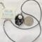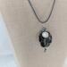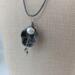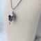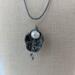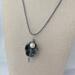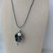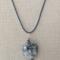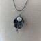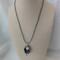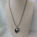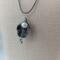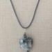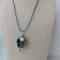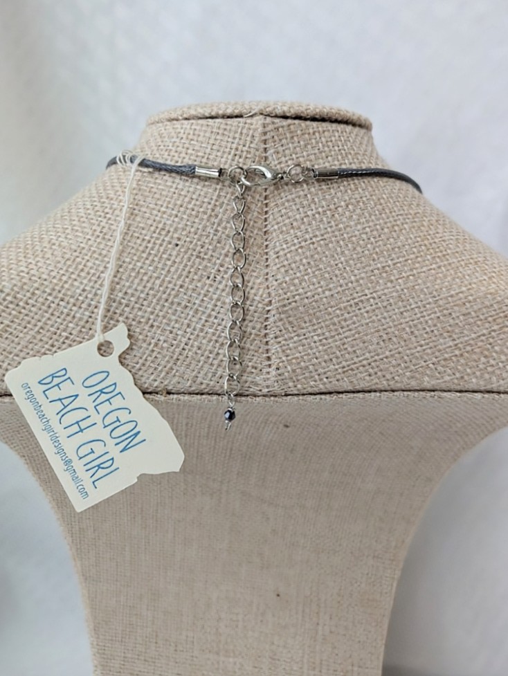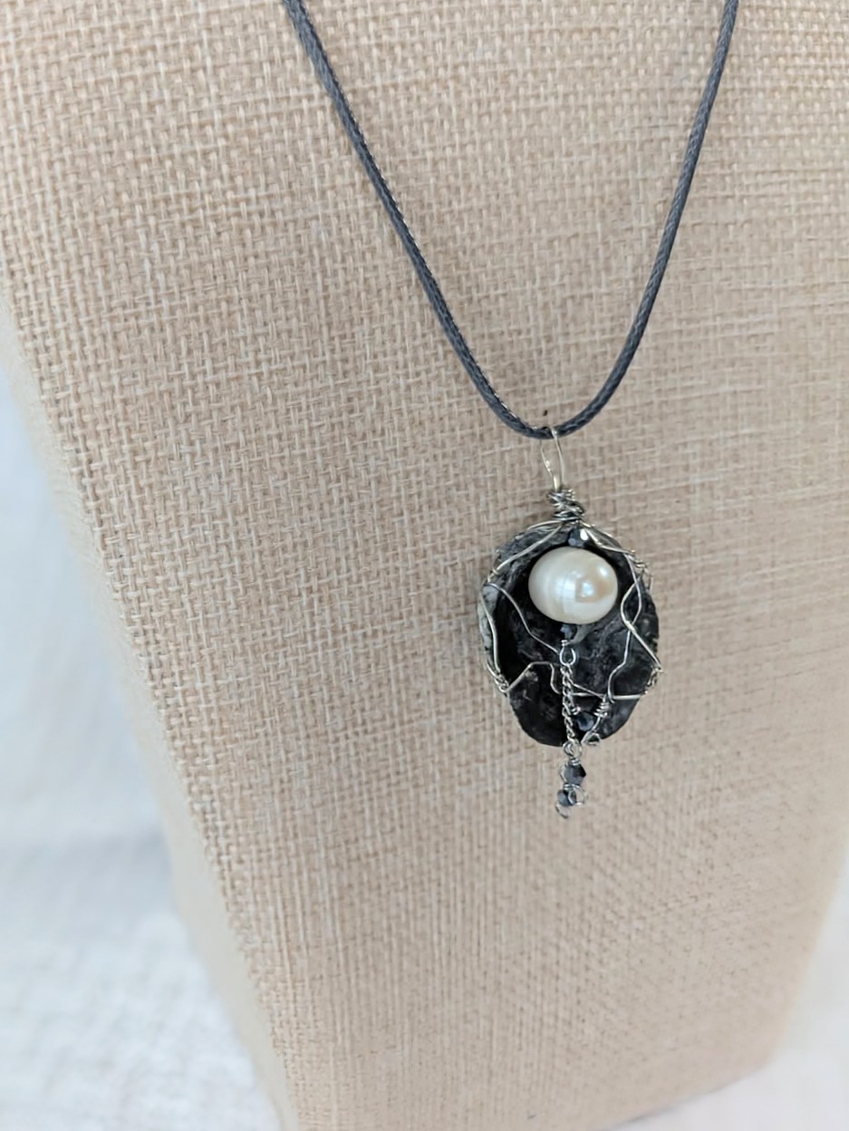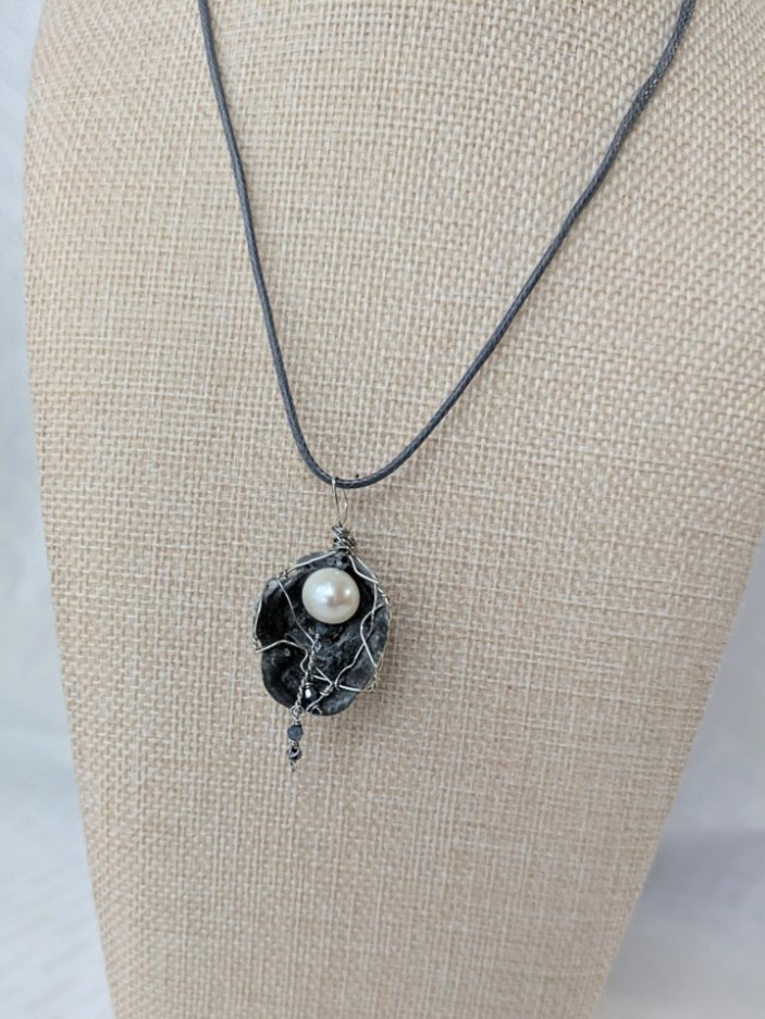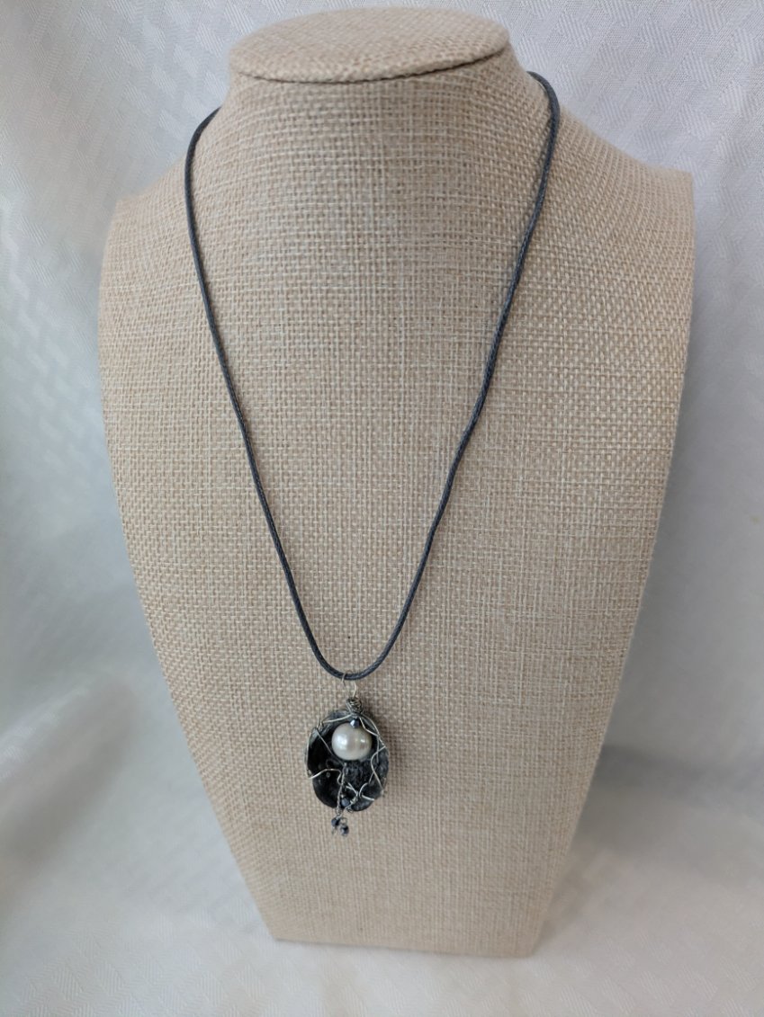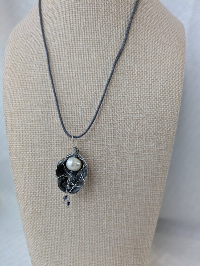 This Freshwater Pearl with beautiful luster is approximately 10 mm in size. It is accented with blue/gray colored tiny crystals that give this peace a monochromatic look. The length from the top of the bail to the bottom of the chain that dangles from the Pearl is approximately 2 and 1/4". The shell is approximately 1" wide by 1 1/4" long. The leather cord is blue/gray in color and is approximately 17" long with a 2" extender.