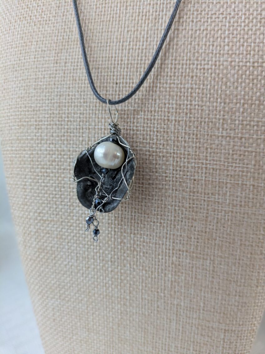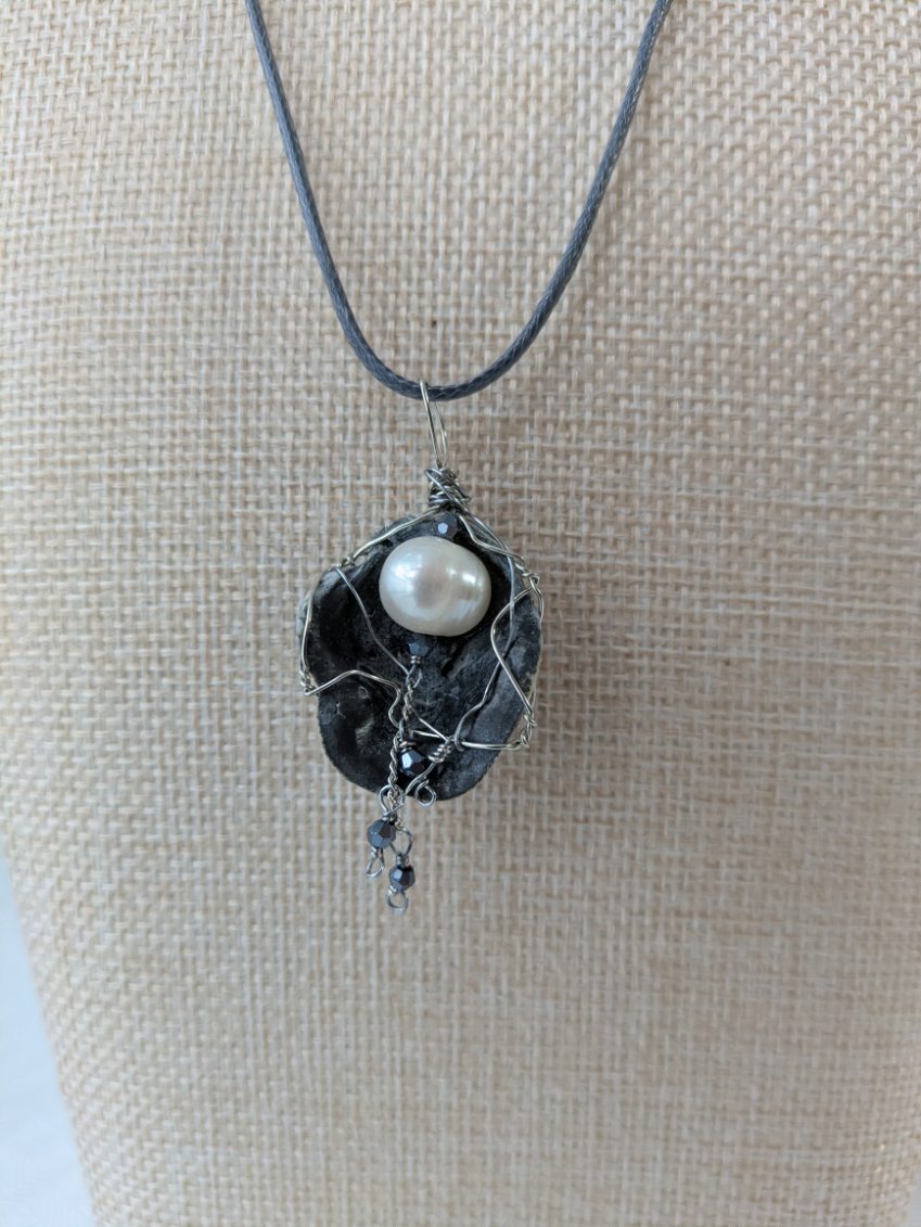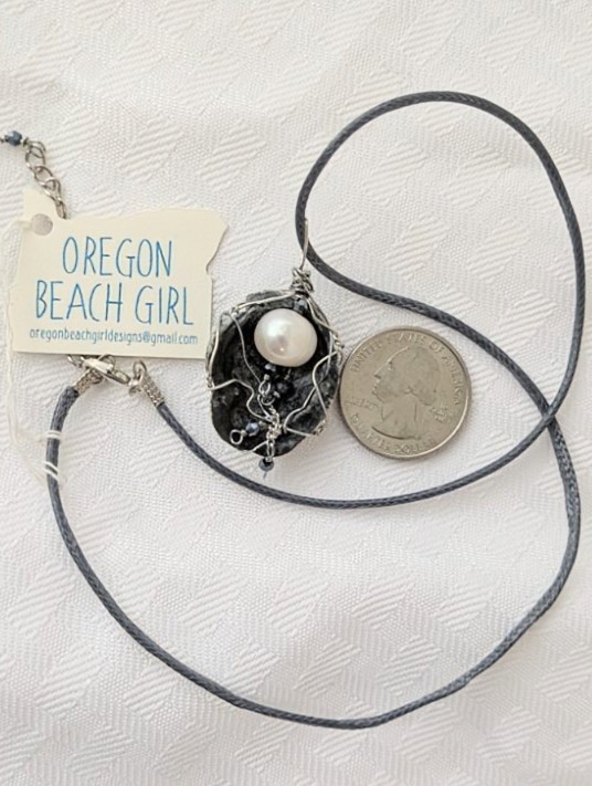 Unique Oyster Shell Necklace featuring a Freshwater Pearl and tiny crystals from Oregon Beach Girl!