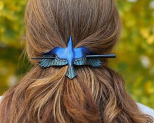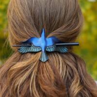 This listing is for one flying raven hair slide with a wooden stick. The leather is dyed and painted coal black with iridescent washes of indigo and violet. At the base of the wings is a black treeline, and the night sky is dotted with metallic silver stars. The shimmering colors have a play of light effect, so the blue and purple tones can shift from very vivid to rather subtle, depending on the lighting. The hand stamped tree line adds beautiful texture.