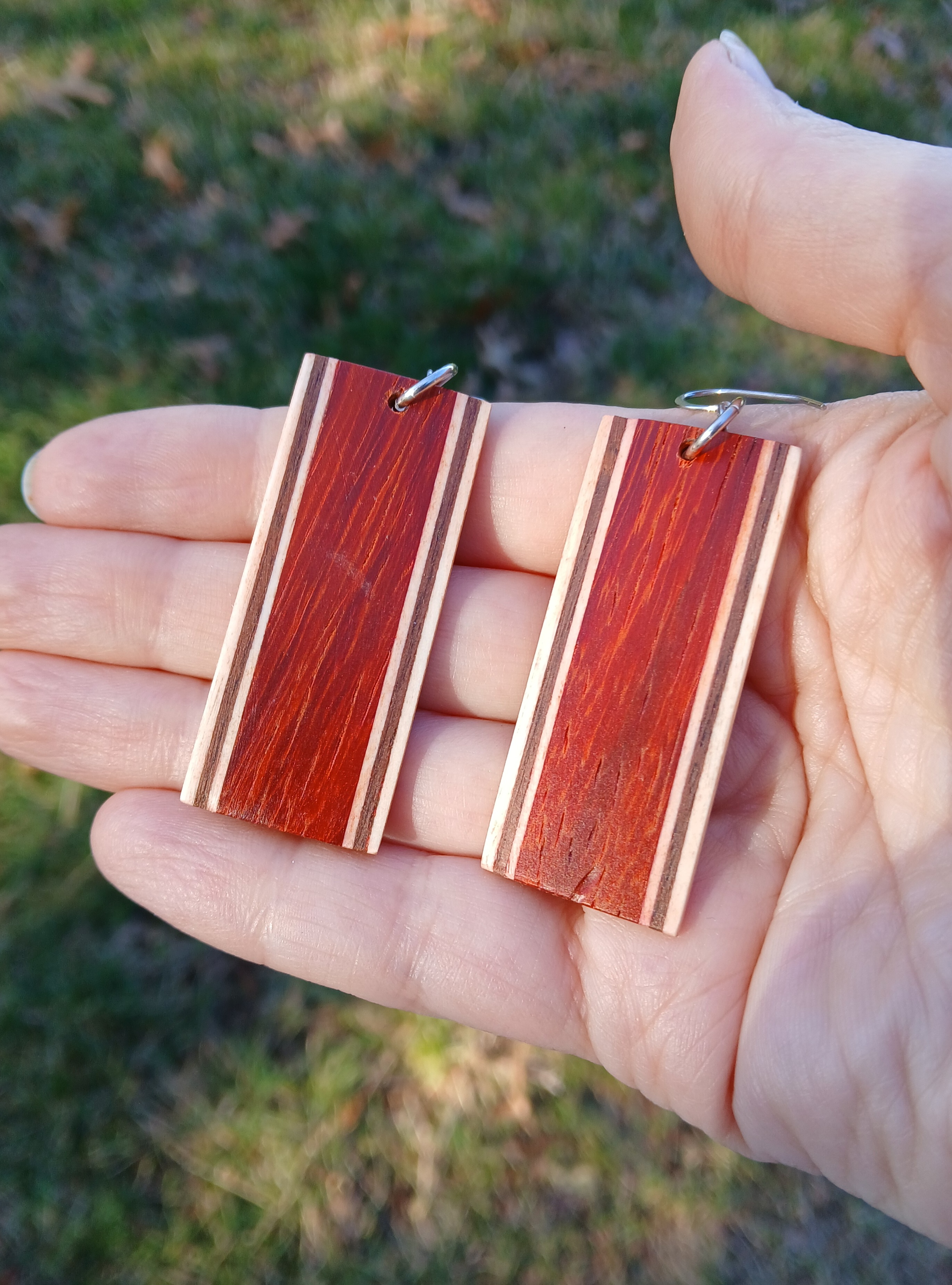 Domino-shaped earrings made of stripes of Padauk, Walnut and Maple. This is naturally colored wood, no stain was used. Satin finish varnish, surgical steel french hooks. 2.75 inches (66mm) long from the top of the hook.