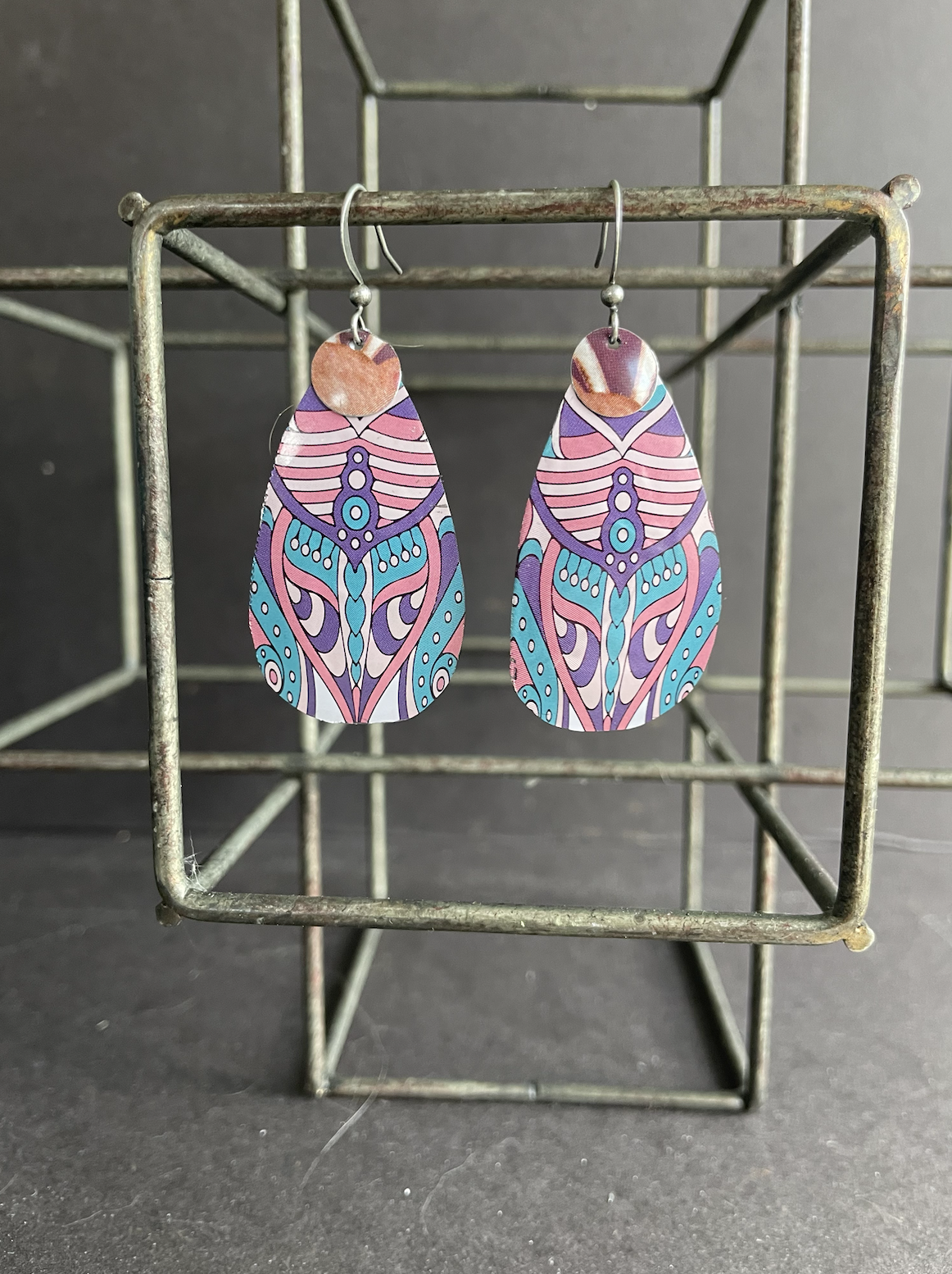 Tins are very light, making them ideal for earrings as they don't weigh down your ears as the day goes on. Did you know the proper term for working with tin is "tinkering"? That made me really happy. I literally tinker in my art studio. I use old cookie tins, tea tins, and the like, break them down, and hand cut them into shapes and hand-hammer them into the 3-D shape I want them to be, finish and polish them, before putting them together like any other jewelry.