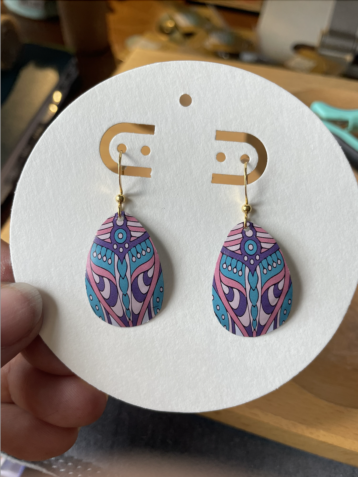 Tins are very light, making them ideal for earrings as they don't weigh down your ears as the day goes on. Did you know the proper term for working with tin is "tinkering"? That made me really happy. I literally tinker in my art studio. I use old cookie tins, tea tins, and the like, break them down, and hand cut them into shapes and hand-hammer them into the 3-D shape I want them to be, finish and polish them, before putting them together like any other jewelry.