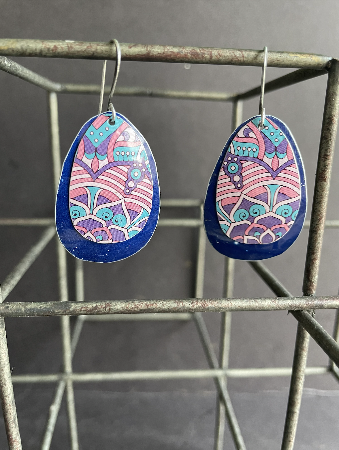 Tins are very light, making them ideal for earrings as they don't weigh down your ears as the day goes on. Did you know the proper term for working with tin is "tinkering"? That made me really happy. I literally tinker in my art studio. I use old cookie tins, tea tins, and the like, break them down, and hand cut them into shapes and hand-hammer them into the 3-D shape I want them to be, finish and polish them, before putting them together like any other jewelry.