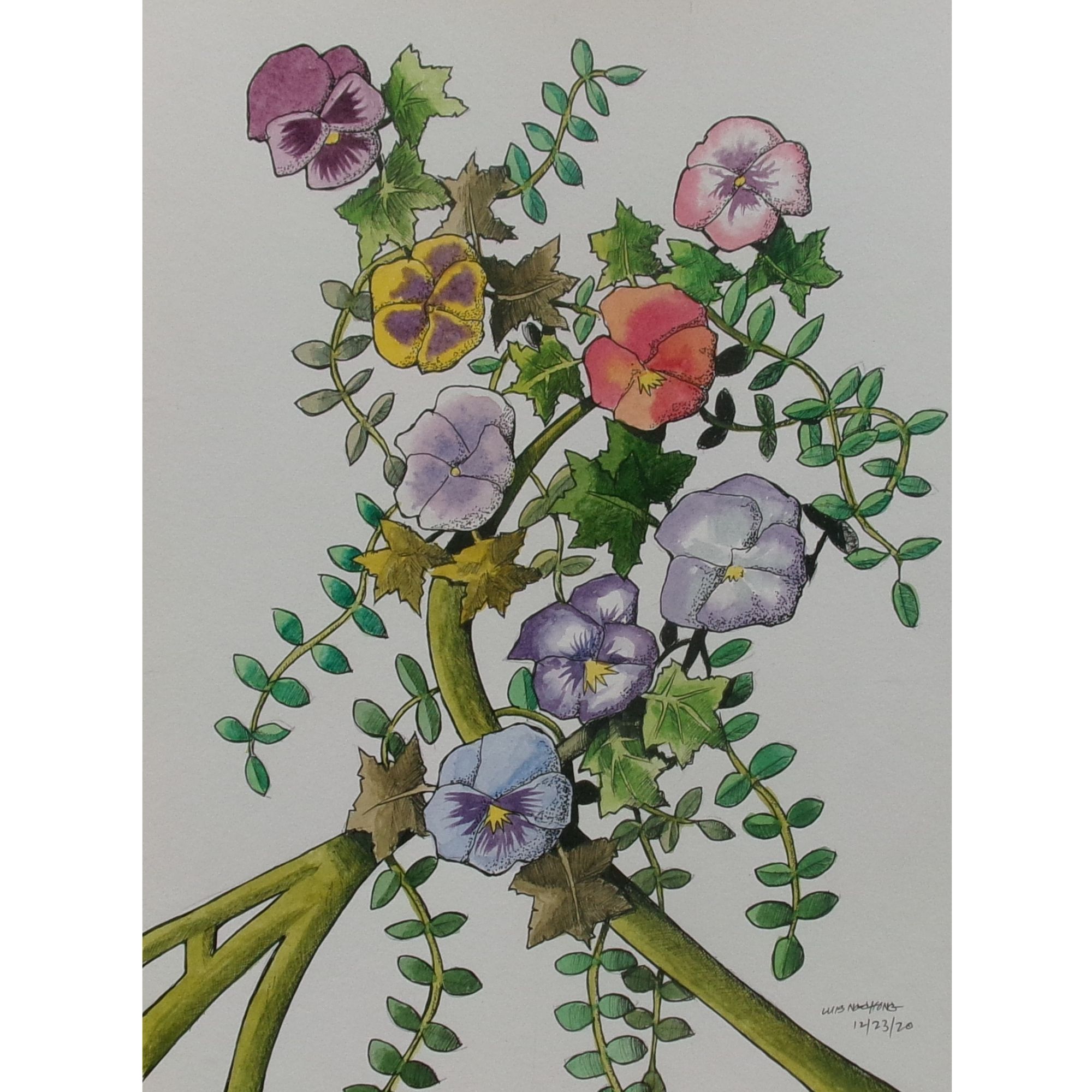 Delicate yet vibrant this original mixed media painting captures the timeless beauty of pansies in an elegant flowing composition. Each petal bursts with color from soft lavenders and deep purples warm oranges and sunny yellows set against lush green foliage. Created with a blend of ink watercolor this artwork brings a sense of natures grace into any space. Whether displayed in cozy hook or as a centerpiece in your home its intricate details organic charm make it a perfect addition to any art collection.