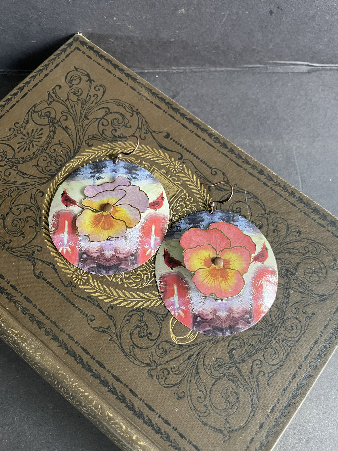 Originally a popcorn tin, the imagery created this fascinating mirror image when the wrap-around image ended. I loved the cardinals, and chose to highlight them with large pansies in the center of the earrings. The findings are silver plated and have a rubber stopper on the back so they won't fall out of your ears.