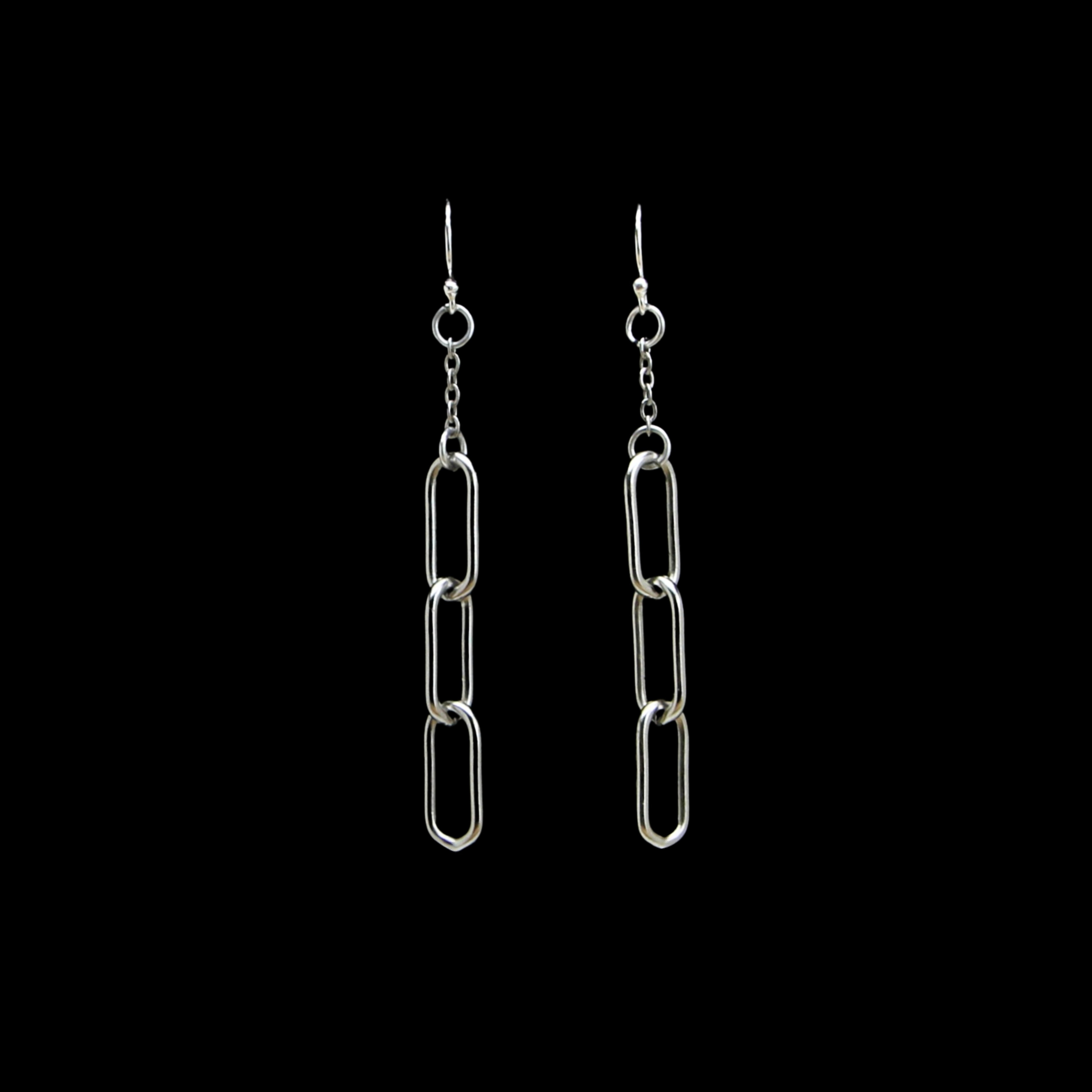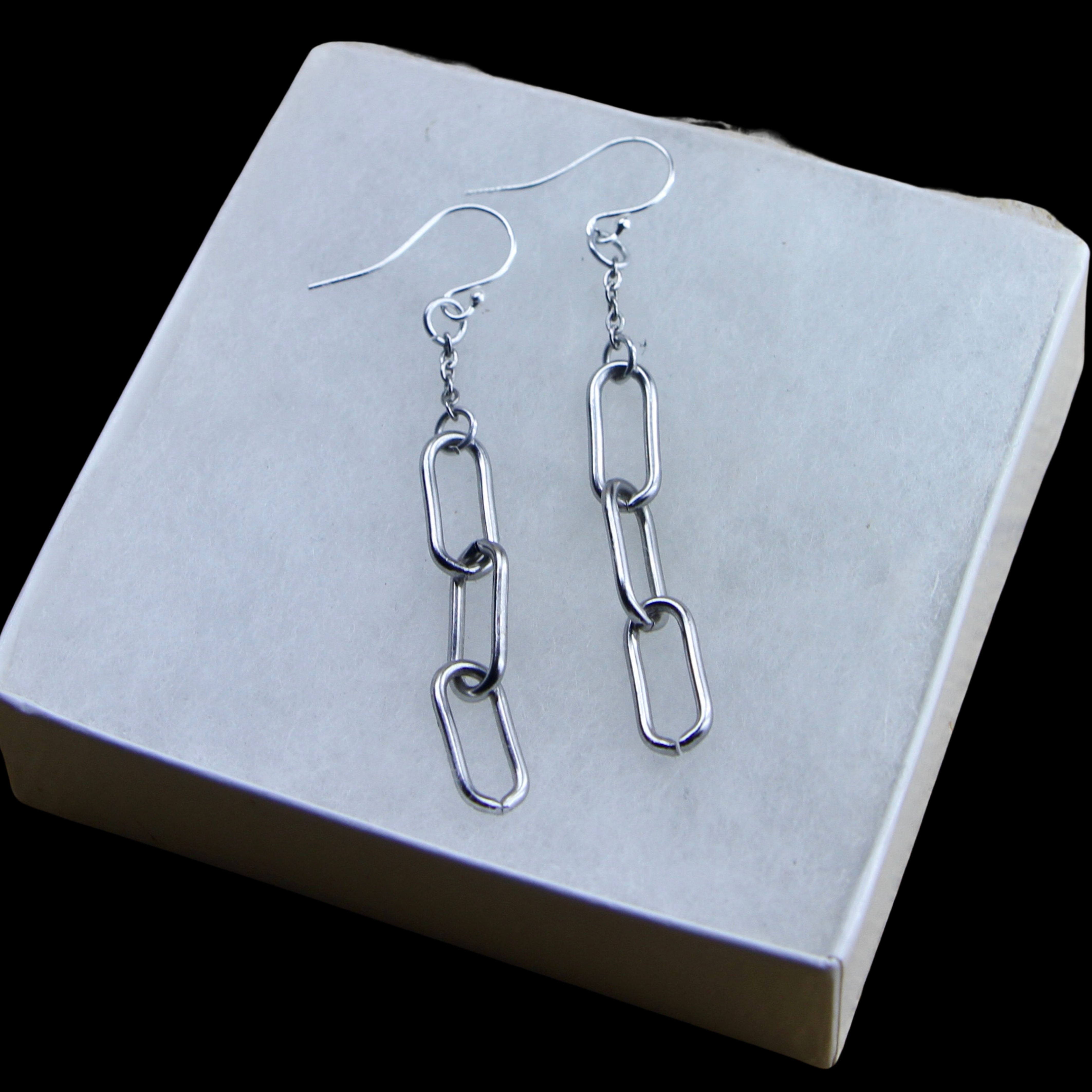 I select six surgical stainless steel paper clip chain links, then cut two equal lengths of surgical stainless steel flat oval cable chain and attach each with surgical stainless steel jump ring connectors. I finish the earrings by attaching solid 925 sterling silver ear wires (which are stamped for authenticity). They make a cute pair of boho earrings!