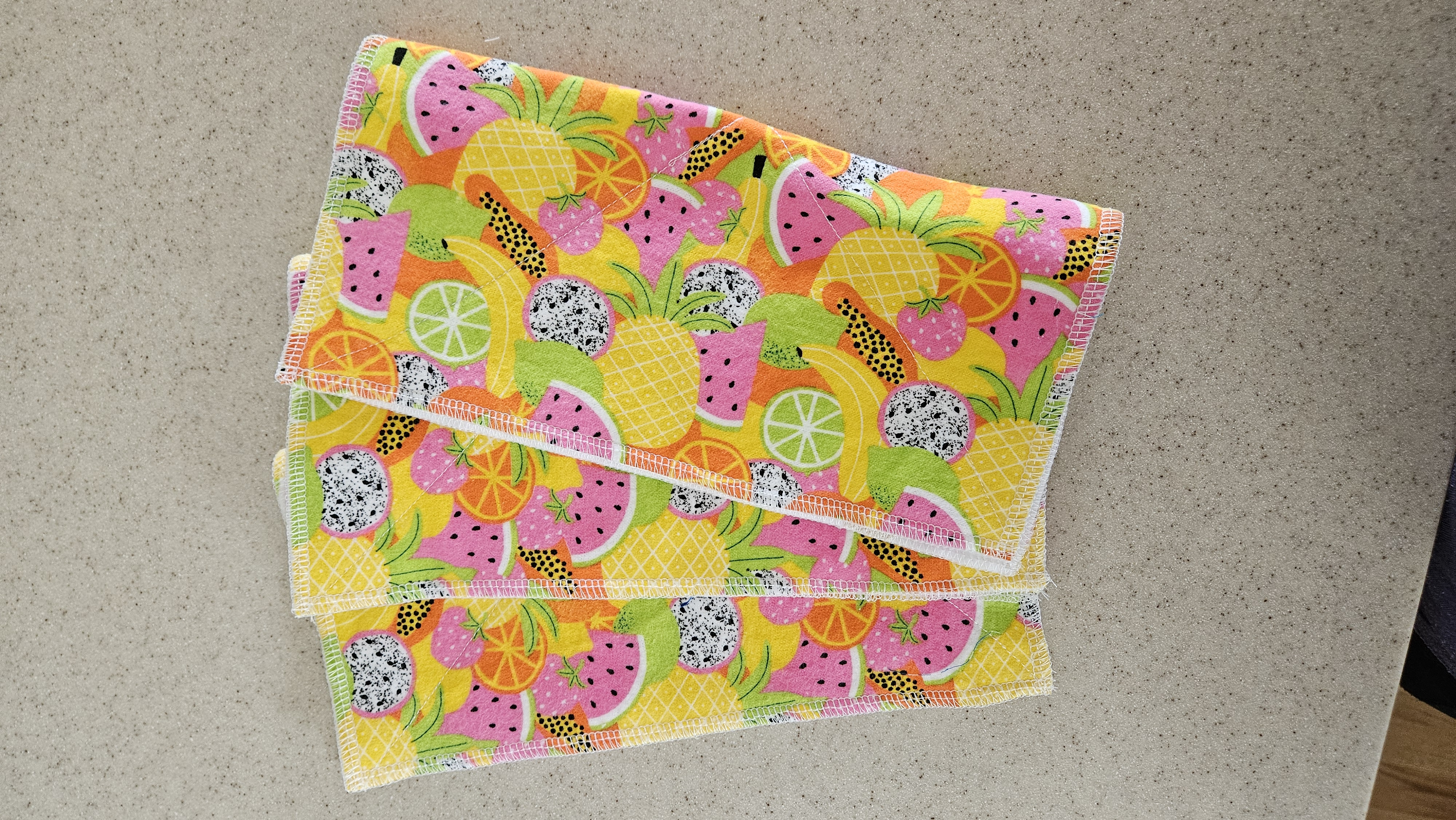 Fabrics are selected for the designs. Each towel can be used 100s of times as a paperless towel eliminating the use for a disposable towel.