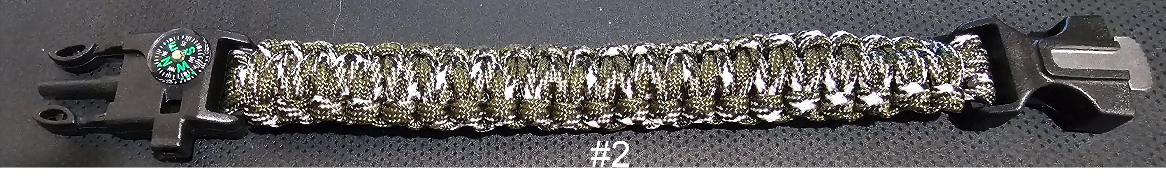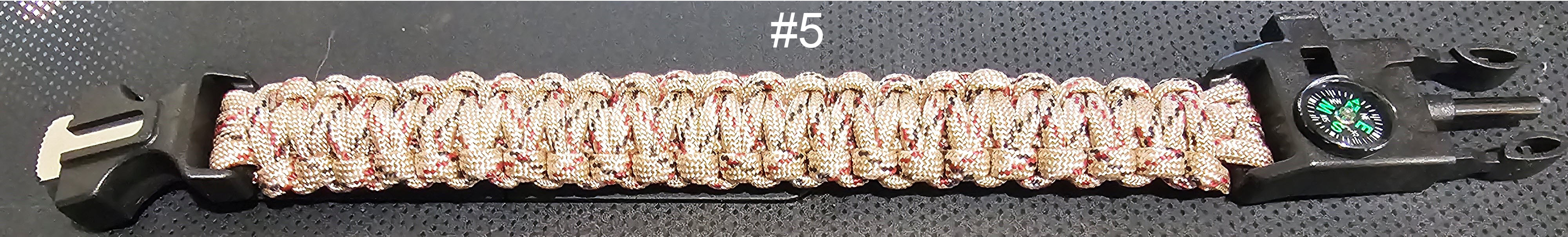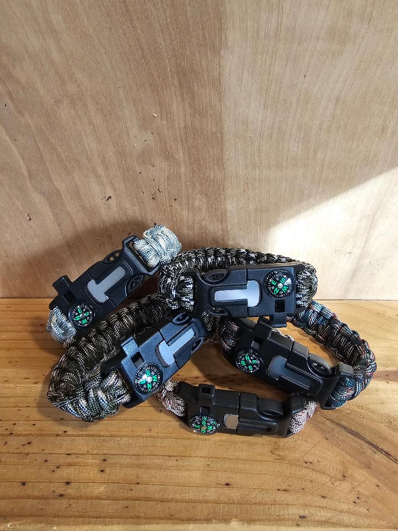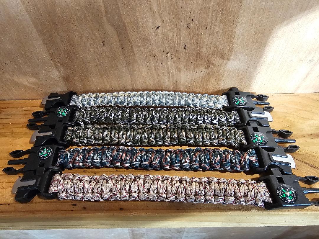 Paracord Bracelets with Compass, Whistle, and cutting tool. Approximately 6 foot of paracord used. Adult size approximately 8 inches.