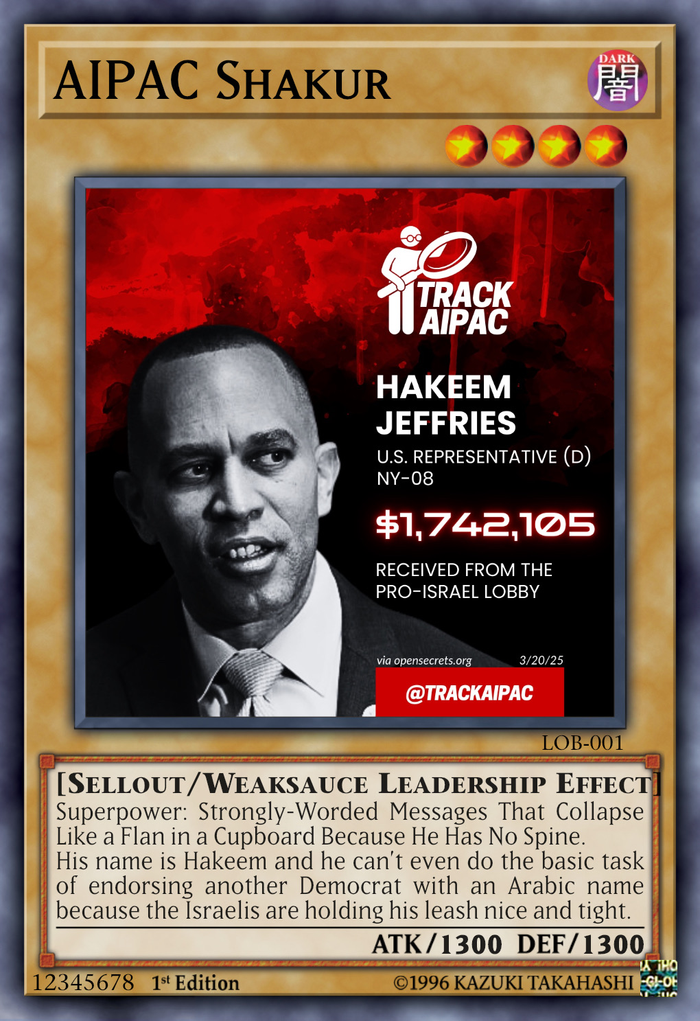 This is not one of those times. Hakeem Jeffries is too busy collecting Zionist blood money to properly do his job.