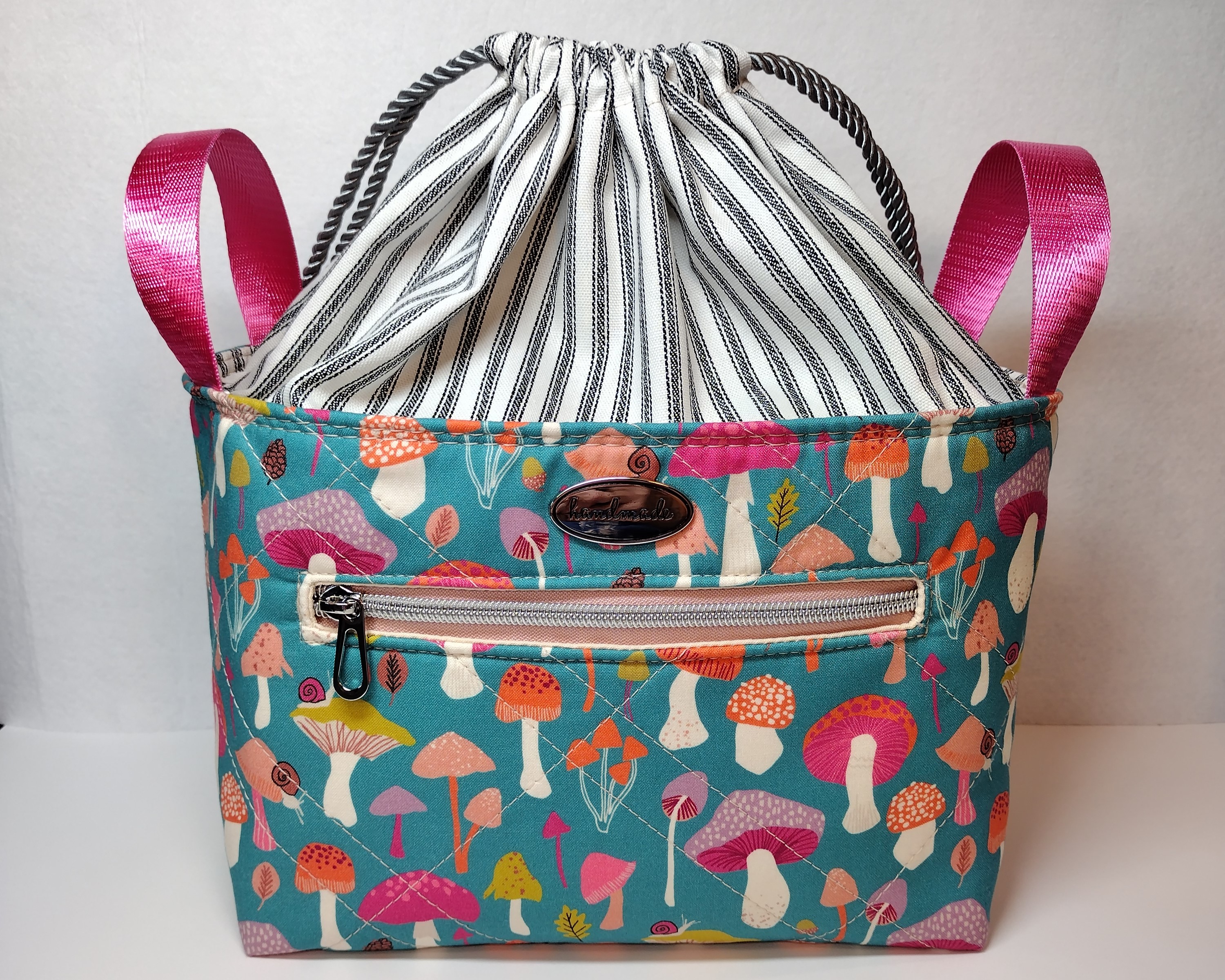 Exterior made with a pastel mushrooms (teal background) cotton print, lined with fleece batting and quilted*