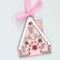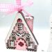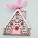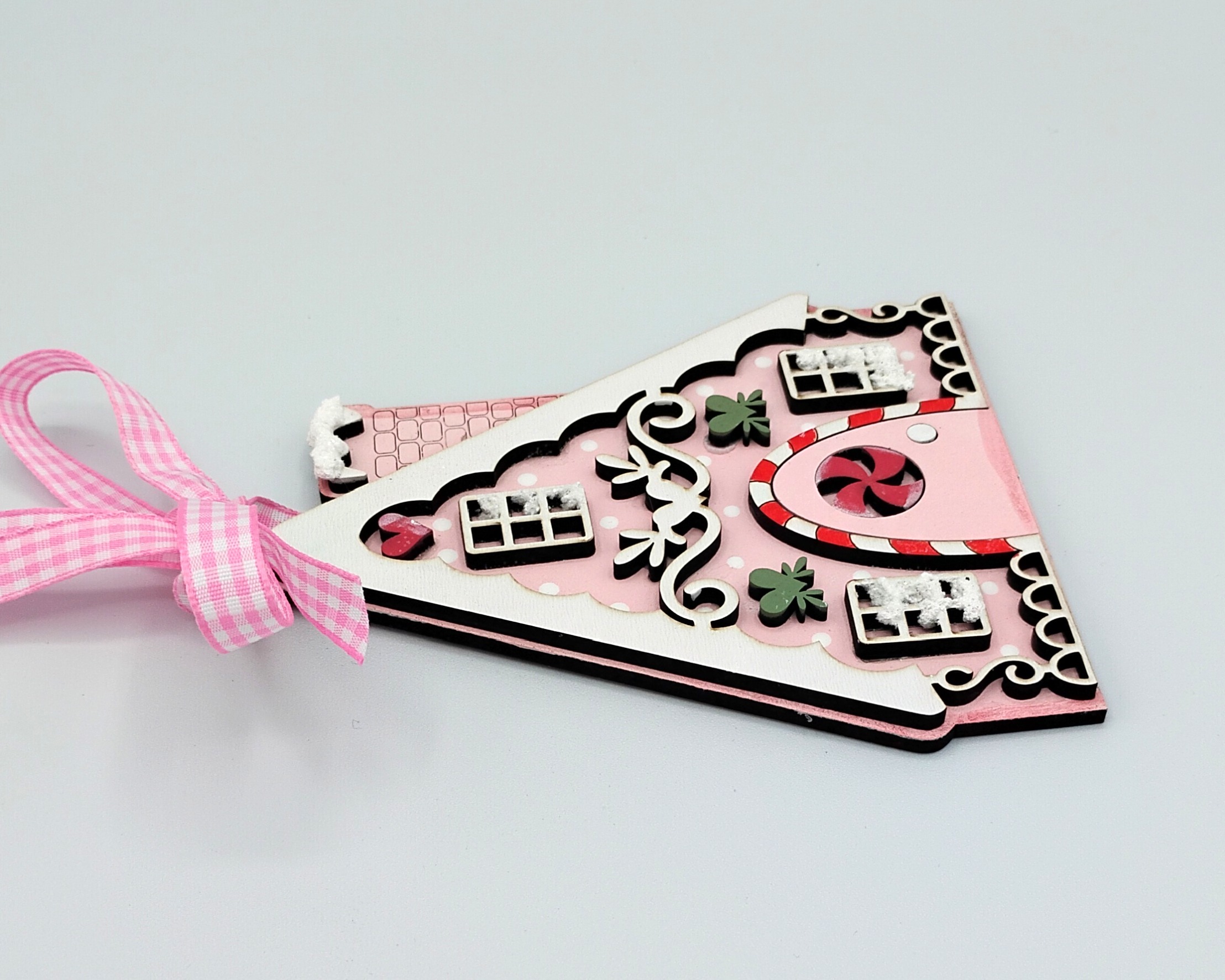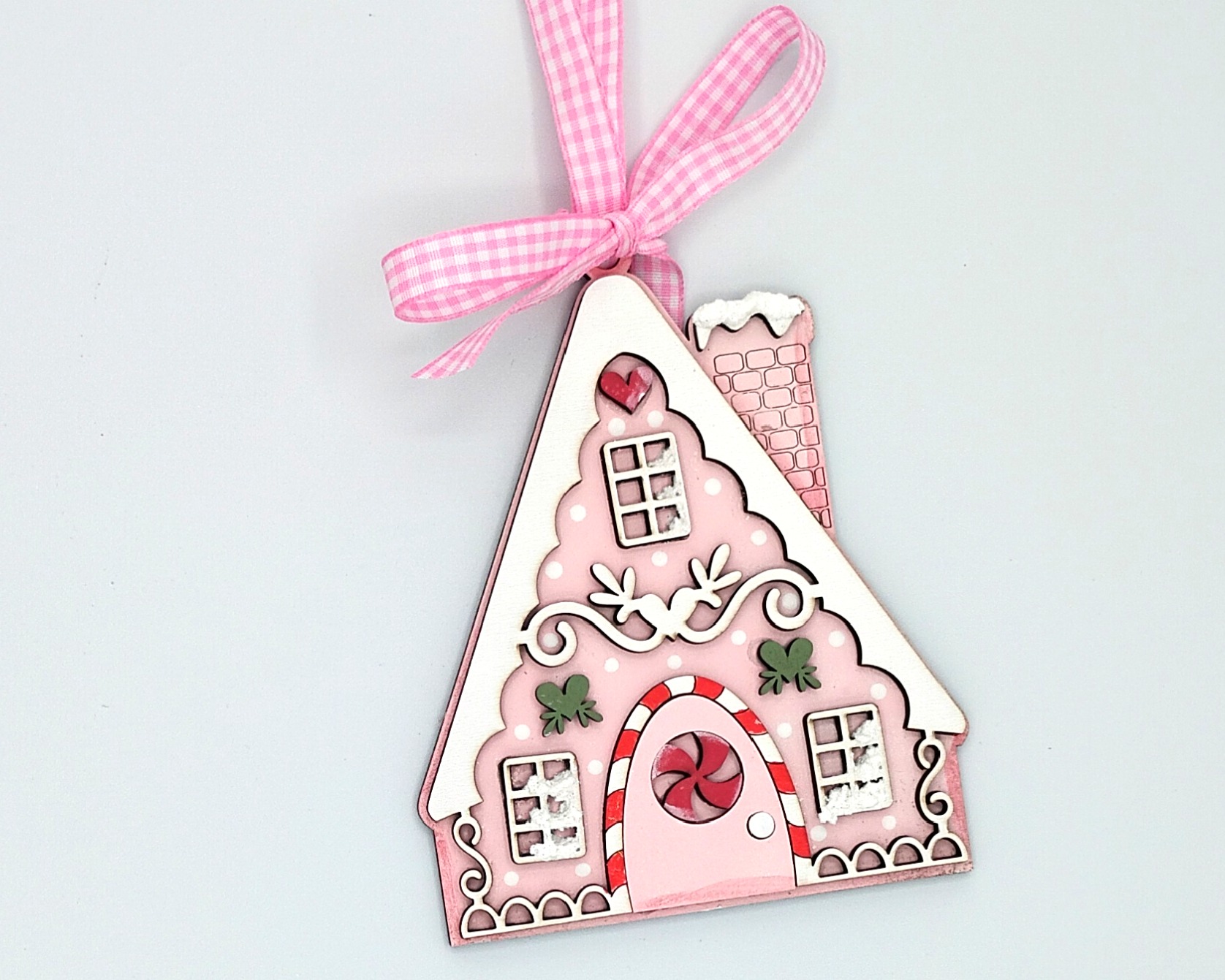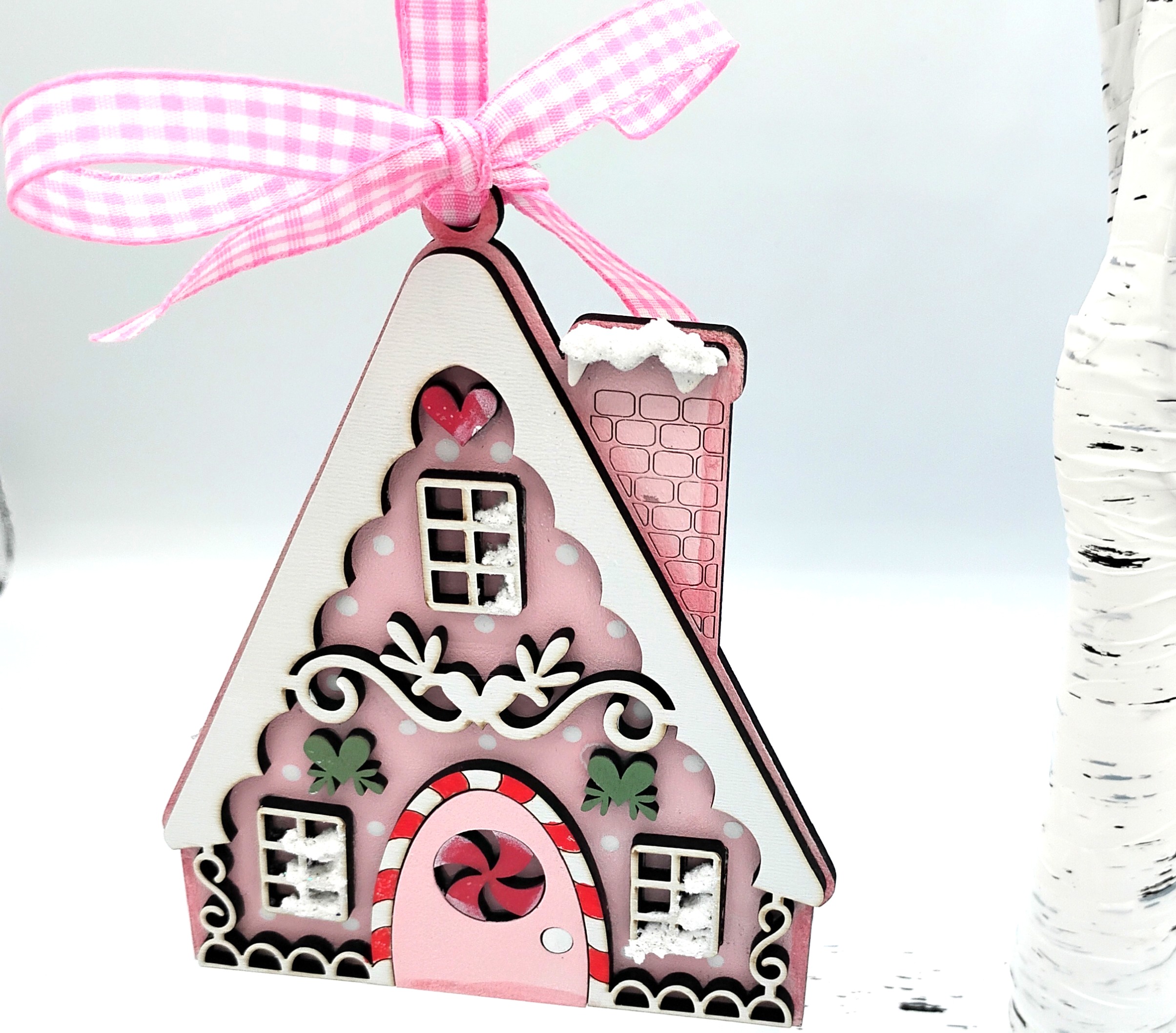 Sweeten your season with this handcrafted gingerbread house ornament, painted in soft pastel pink and snowy white. Laser cut from 1/8" wood and hand-painted with care, this layered ornament features candy cane stripes, shimmering glitter, and textured Snow Tex for a frosted finish. Sealed with a clear protective spray to preserve its charm year after year.