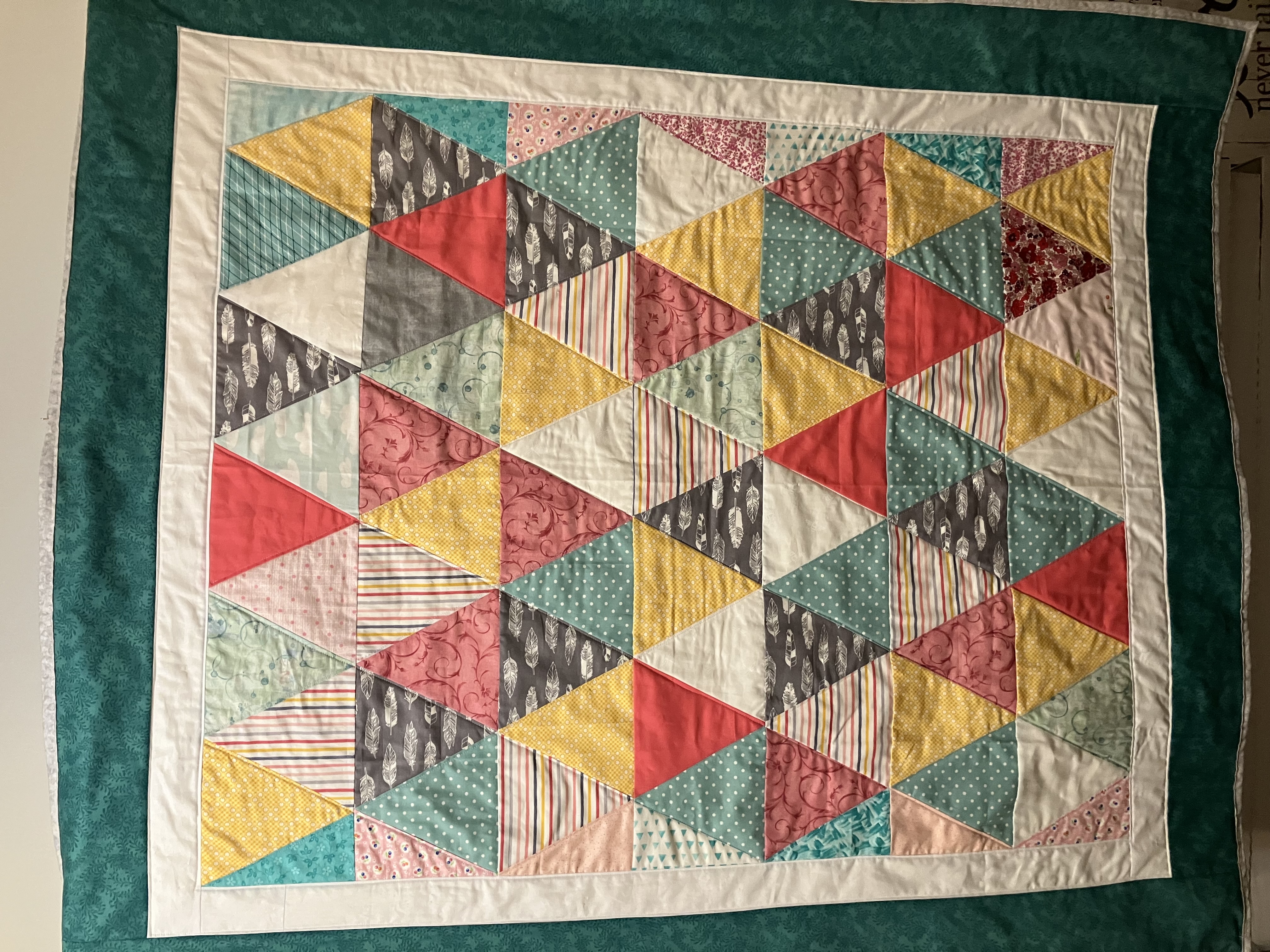 This quilt measures 54x45" and features pretty pastel triangles. It's a great size for that special lady; may she be 5 or 95.