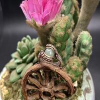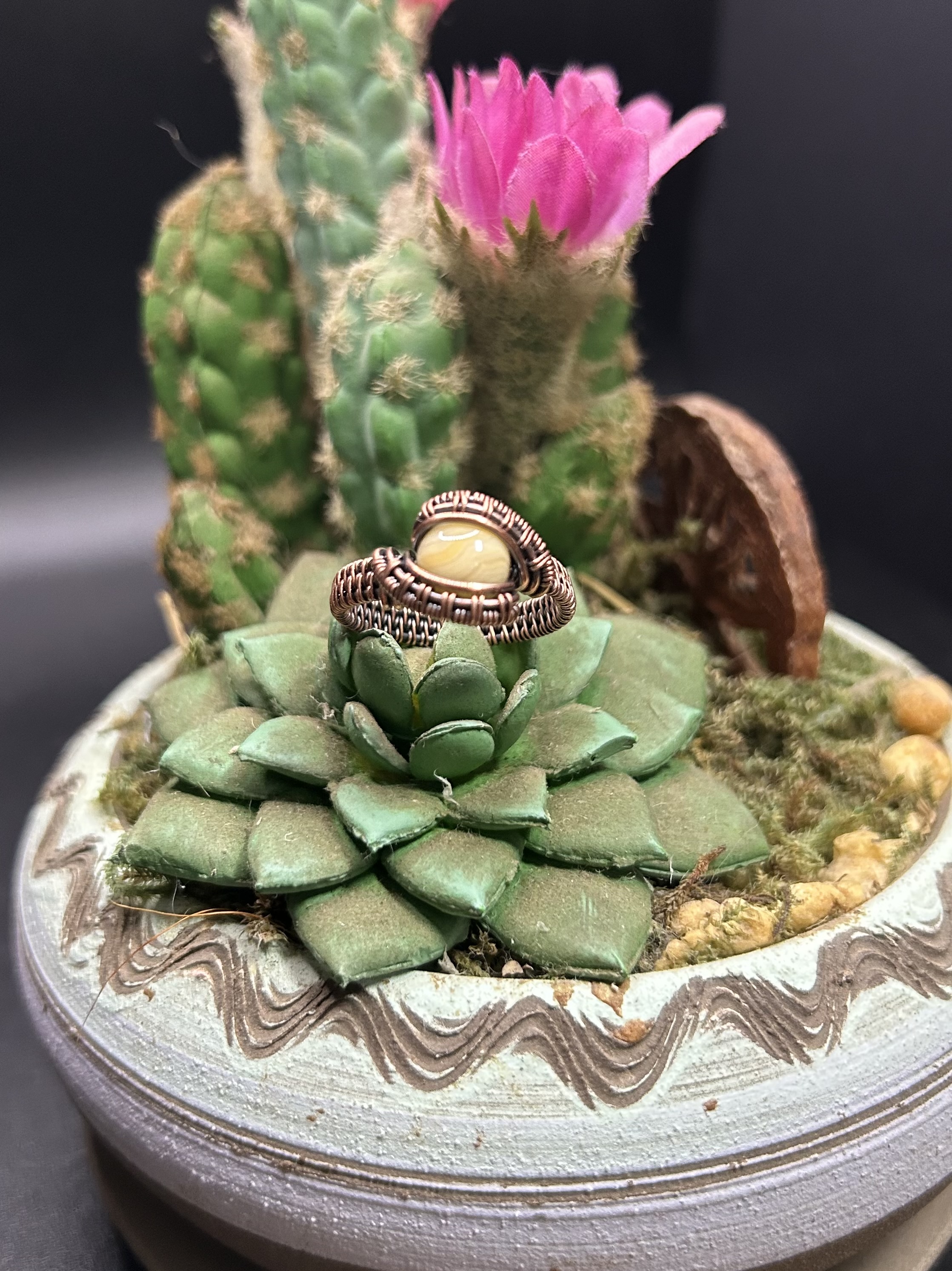This ring is wire wrapped with bare copper wire. Then it was oxidized to produce a darker color. There is an 8mm Crazy Lace Agate round cabochon enclosed in the center of the ring.