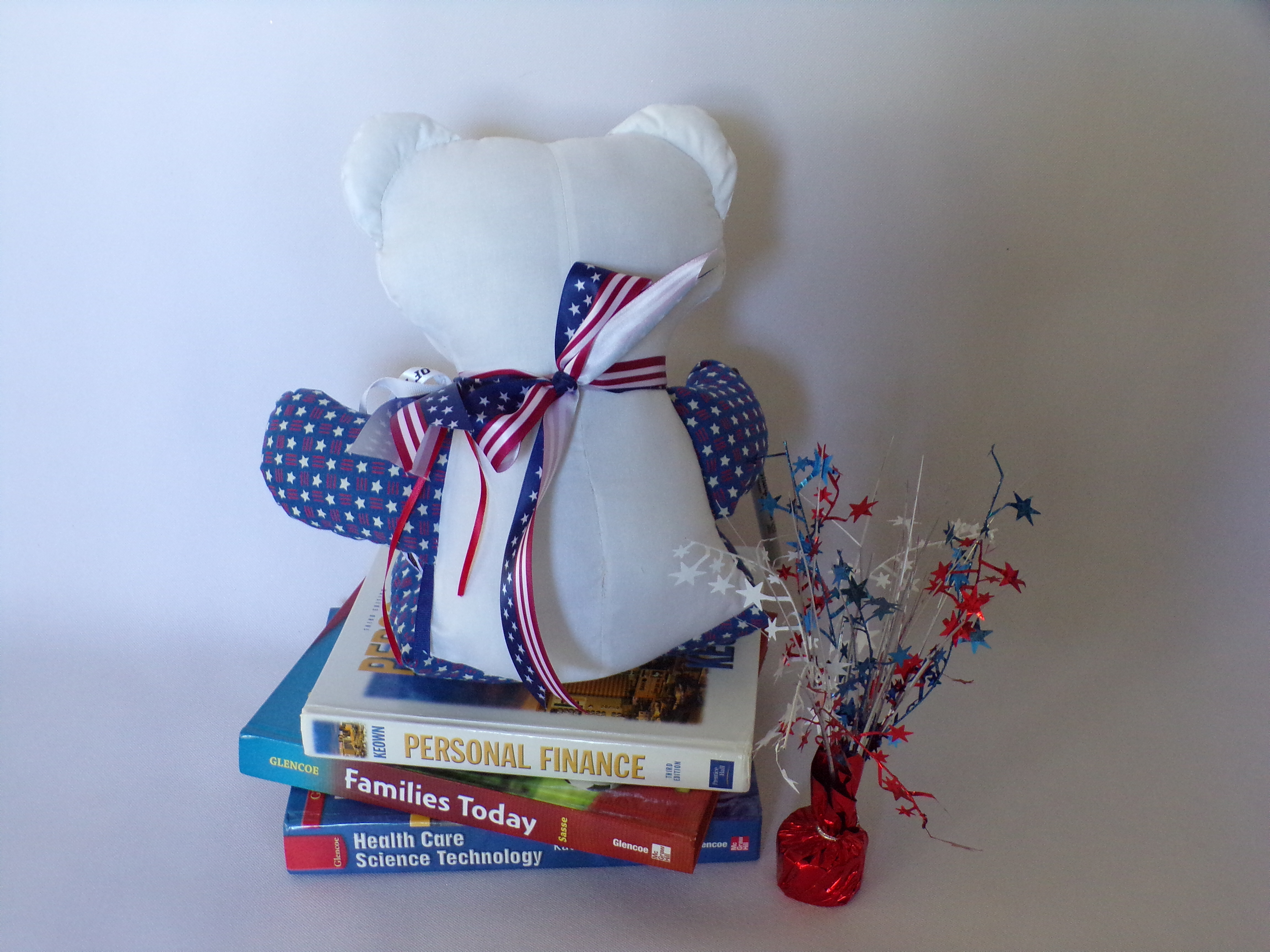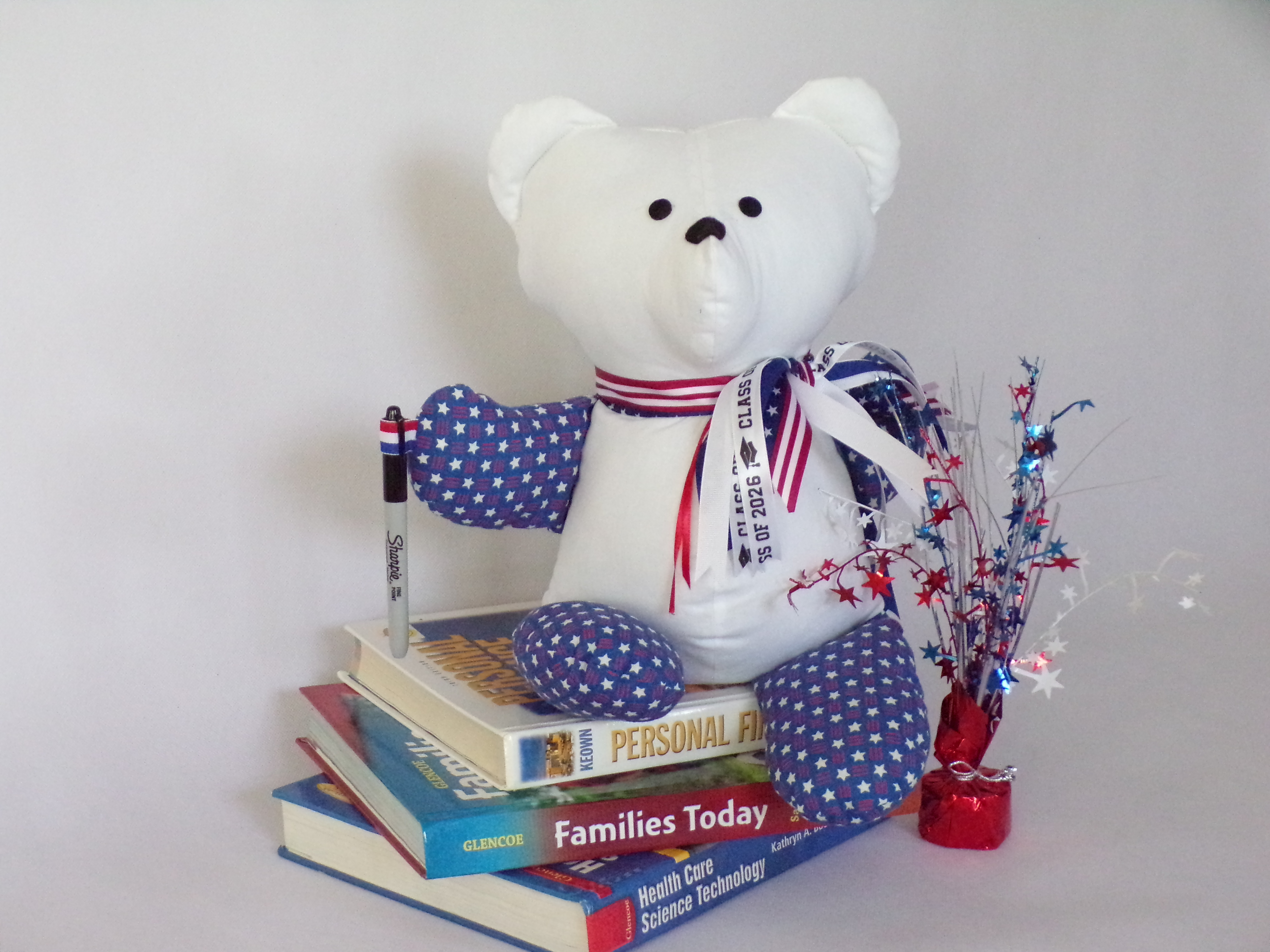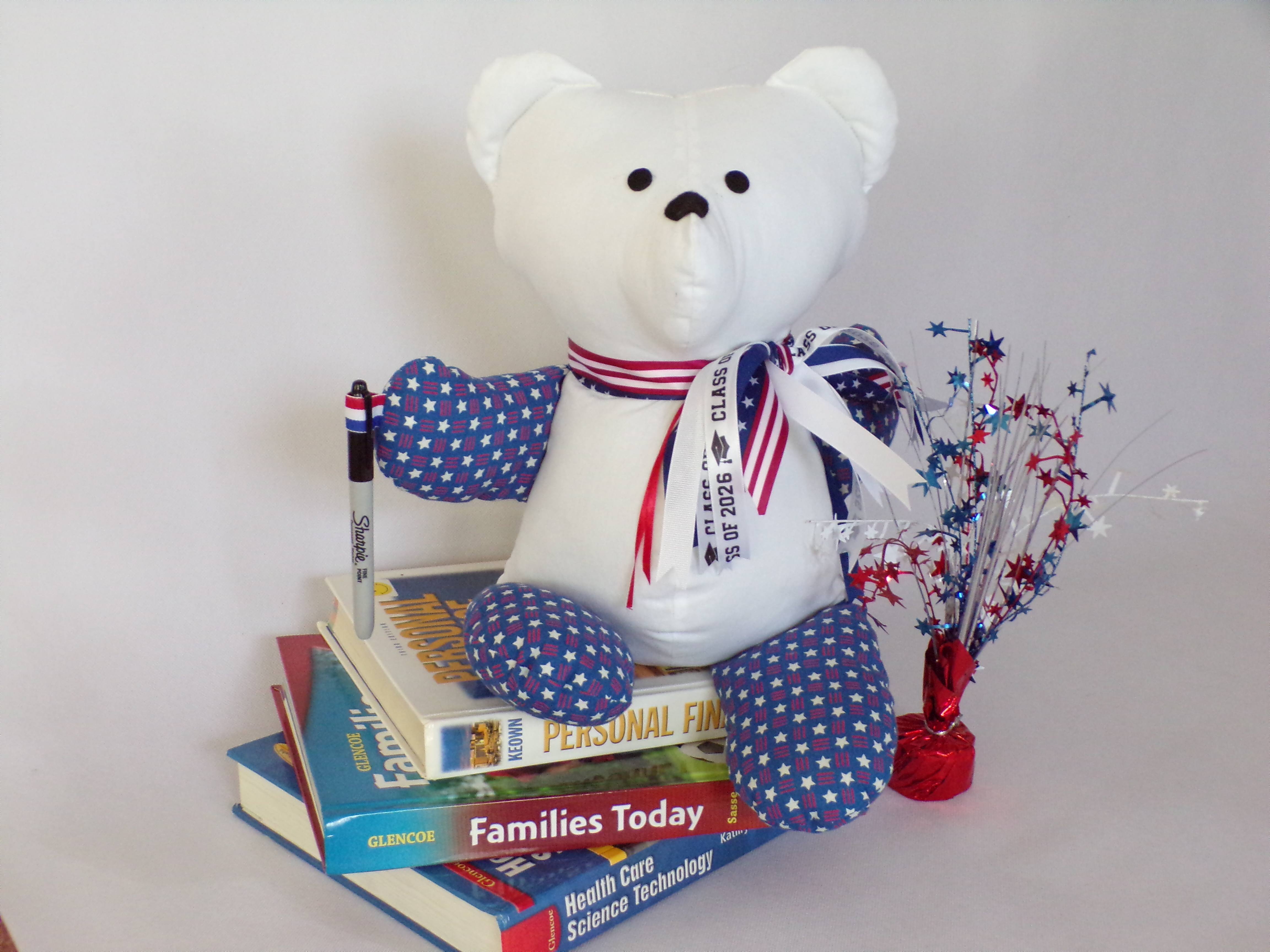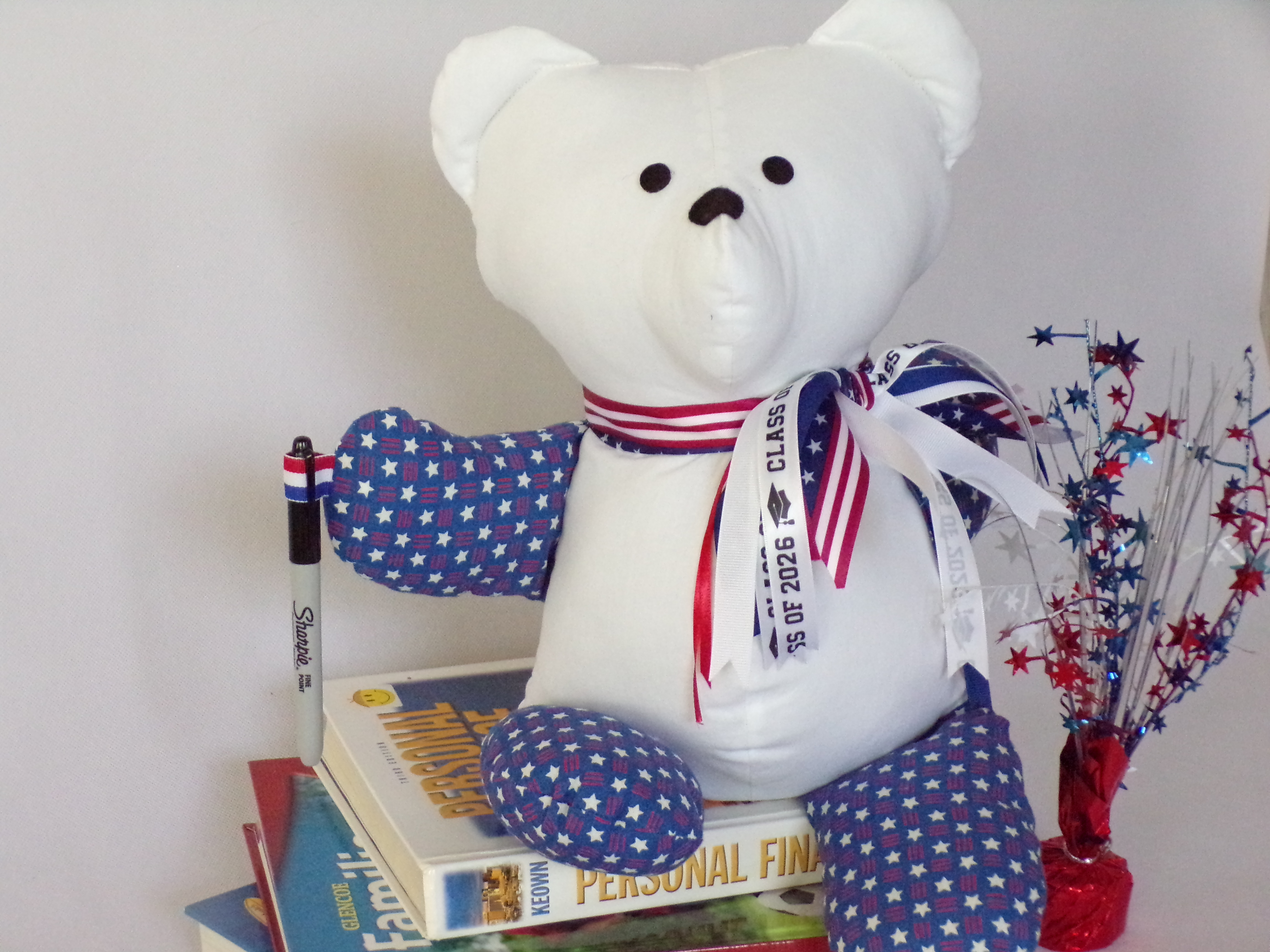 The Class of 2026 has been 250 years in the making. If you're lucky, your family may have a senior graduating this year. Help your senior have an historical year with the Patriotic Autograph Bear. Bear is 18 inches long, has loop sewn into one of its arms for pen, and plenty of space for senior autographs. PLEASE NOTE: Bear has not been designed to be a toy and should not be given to children. Eyes and nose are glued on. Bear has not been designed to be washed, especially after signatures have been added. Only one bear available. Books and pen seen in photos are for display purposes only and not for sale.