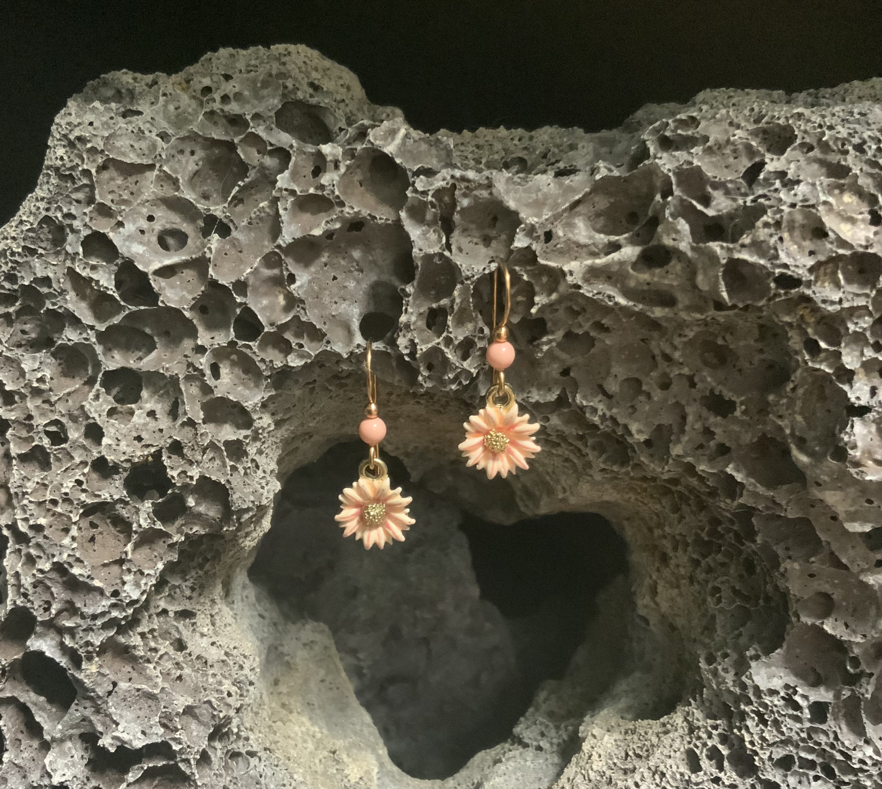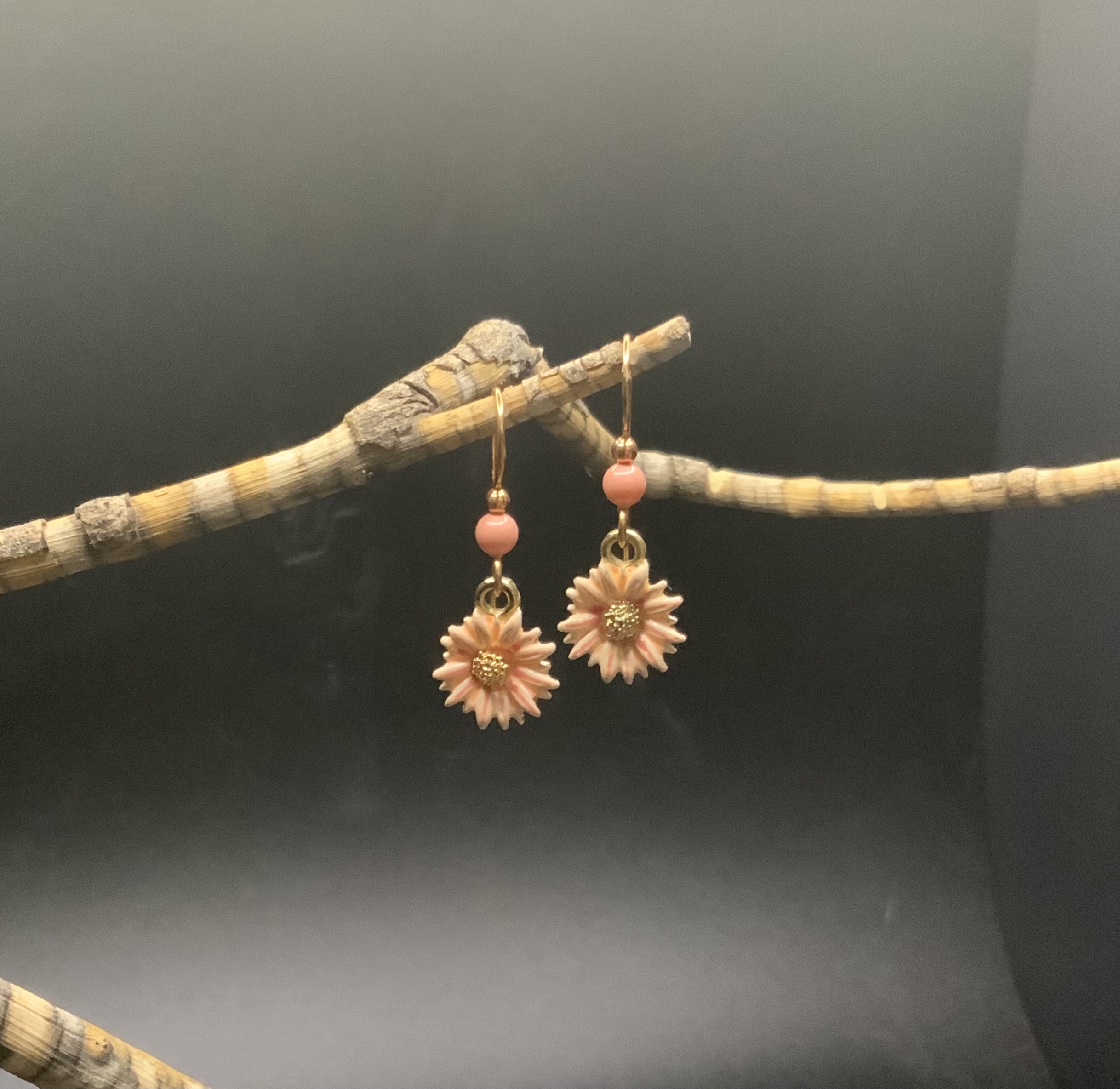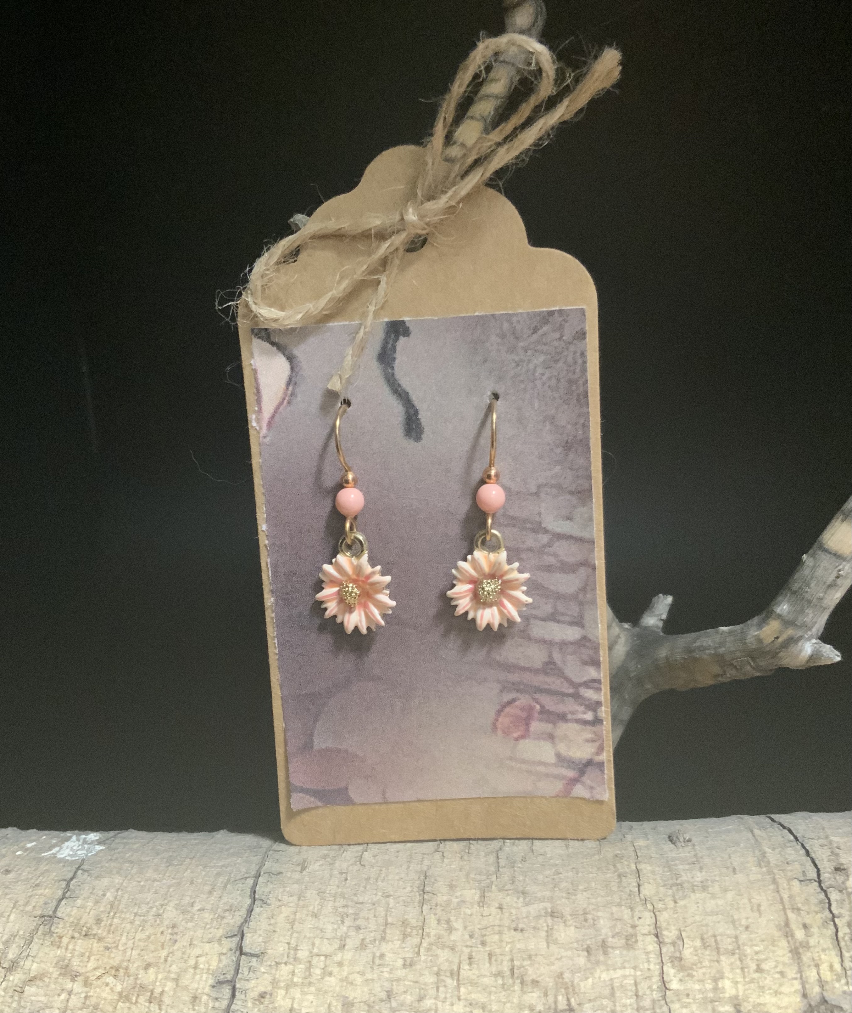 These delicate flower earrings have handmade bronze ear wires with 4mm peach glass pearls. The painted peach flowers have red highlights with a gold plated center. These small delicate earrings would be great for those Spring and Summer days. Each pair of earrings comes displayed on a handmade card.