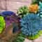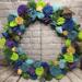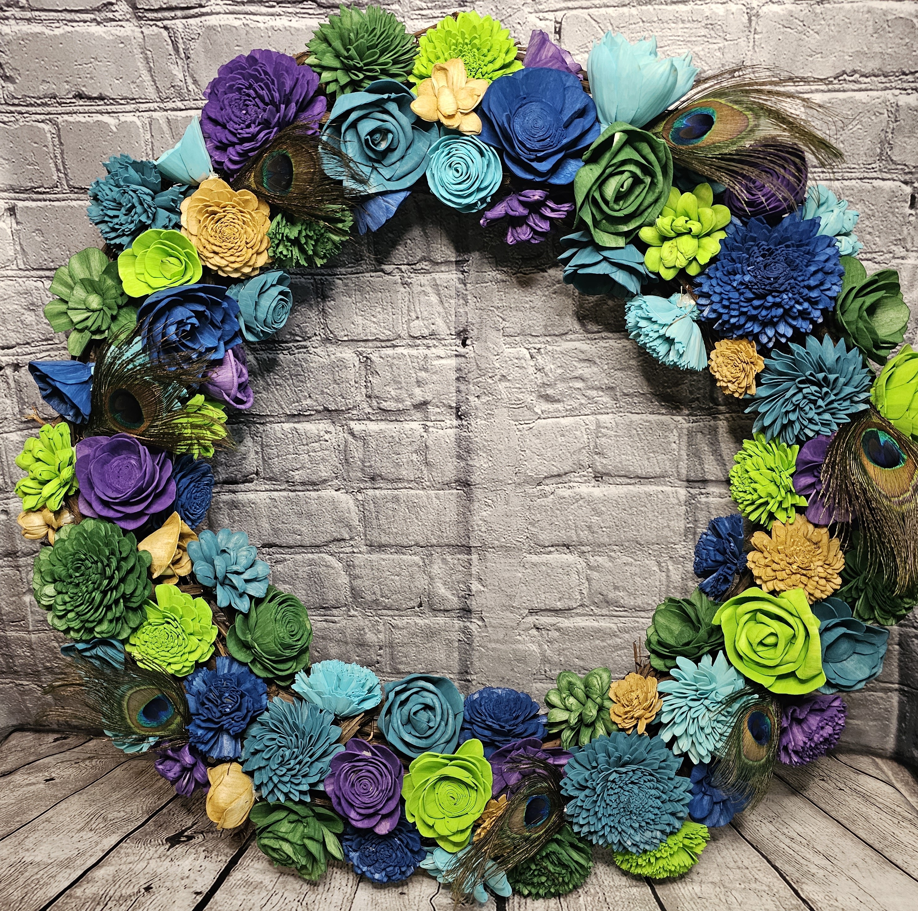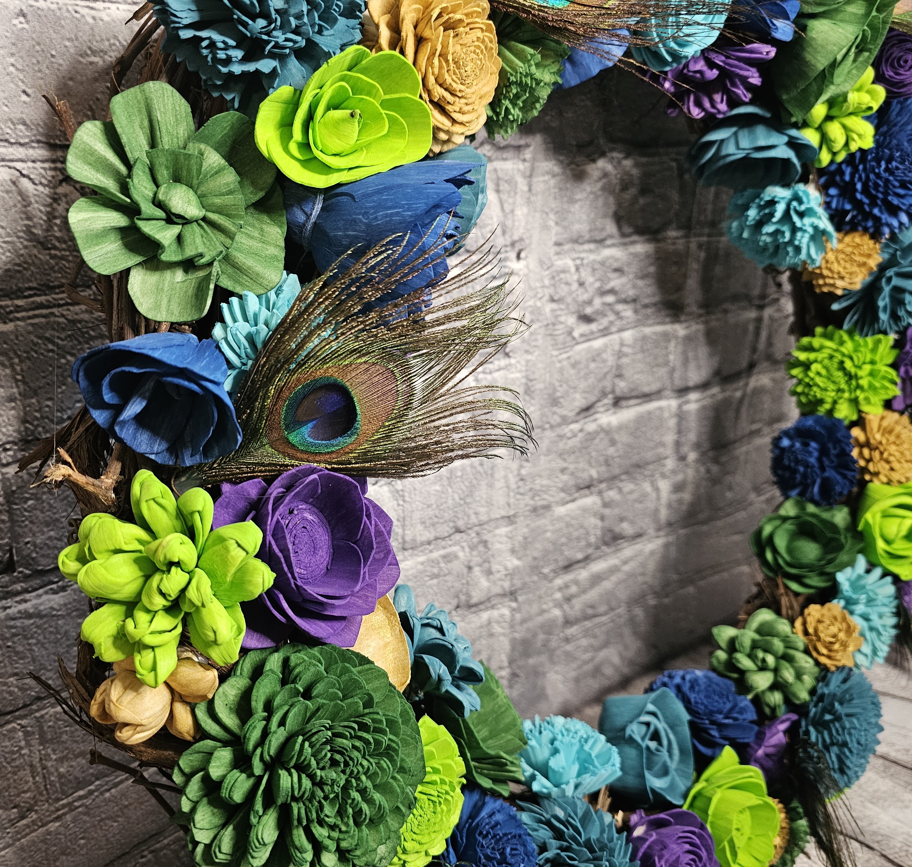 This 18" natural grapevine wreath features approximately 75–100 hand-dyed sola wood flowers in a carefully curated peacock-inspired color palette: teal, navy, light blue, forest green, lime, gold, and royal purple.