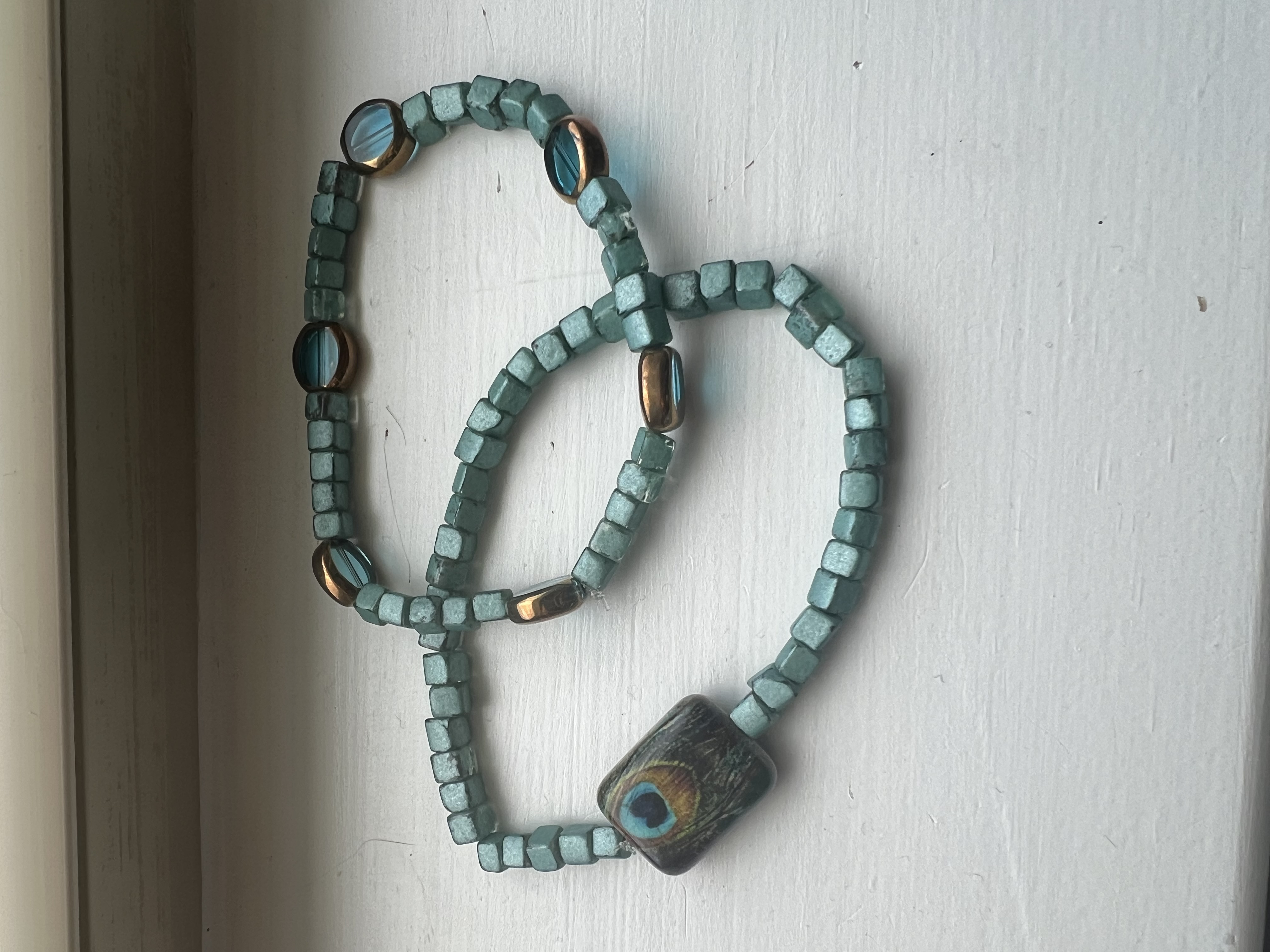These bracelets features soft teal cube beads. One bracelet is paired with the shimmering oval accents and the other features a beautiful peacock feather focal bead.
