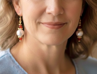 These elegant drop earrings combine classic sophistication with a vibrant pop of color, making them a versatile addition to any jewelry collection. Handcrafted with precision, they feature a lustrous white faux-pearl centerpiece framed by brilliant ruby-red crystal accents and gold-toned spacer beads.