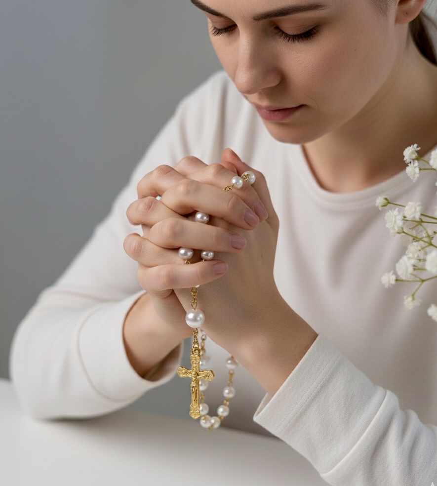 Celebrate faith and elegance with this handmade white pearl rosary, featuring luminous faux pearls and a beautiful gold-plated crucifix and Mary.