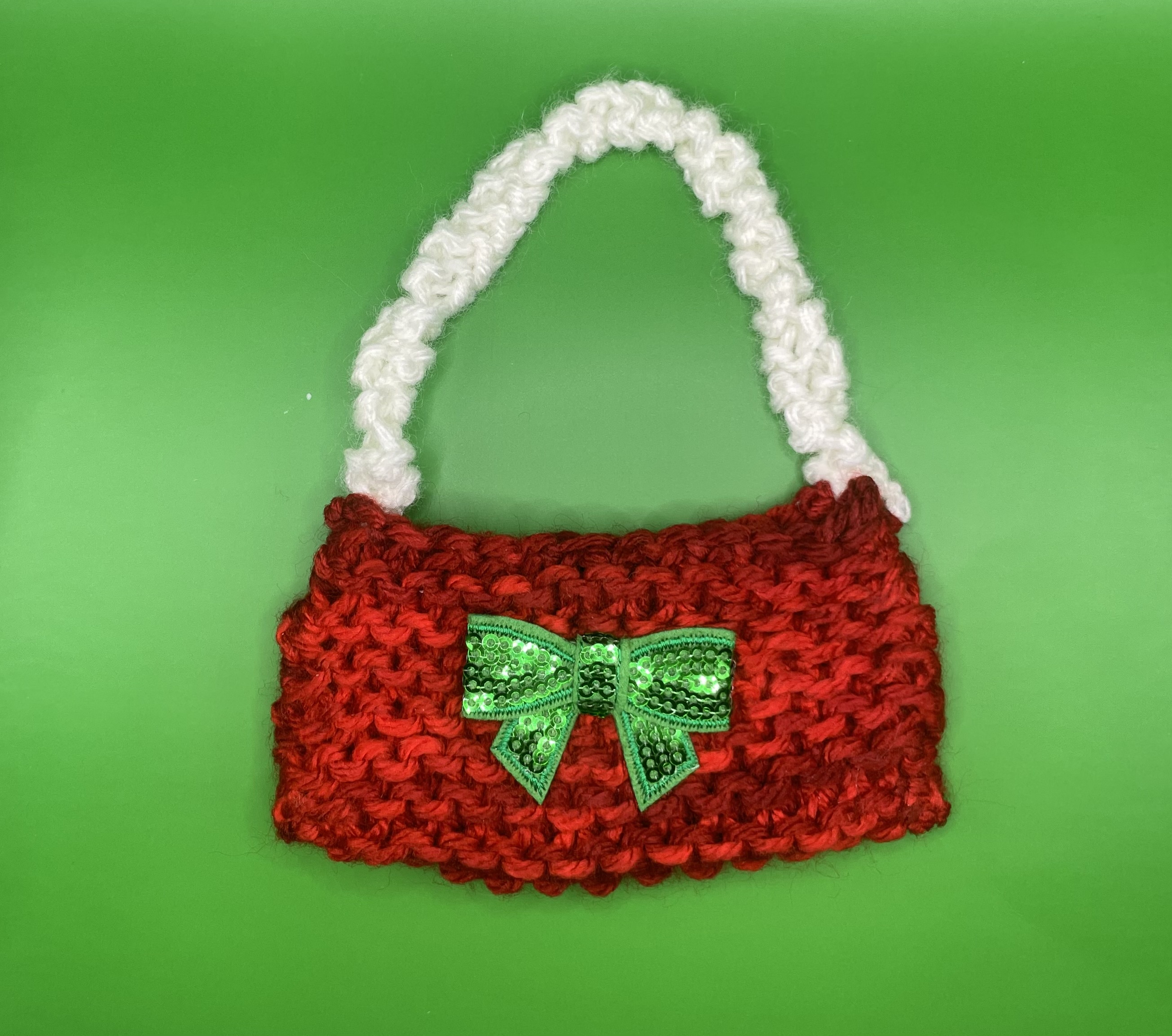 First, I always choose a yarn color that “speaks to me.” Next comes hand knitting the base of the bag followed by adding a strap - also hand knitted. The last step (my favorite) is adding the embellishment! Through the process I imagine the child receiving this doll accessory. That always puts a big smile on my face. Christmas bags are especially fun to design. Enjoy❣️