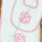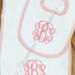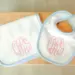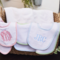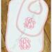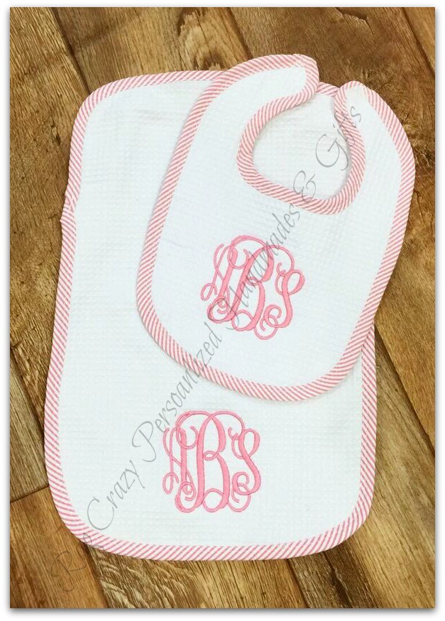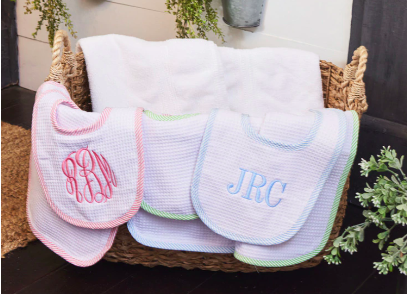 This personalized baby burp cloth and bib set is a timeless and thoughtful gift for any new baby. Made from soft, waffle weave absorbent fabric and finished with classic pink trim, blue and green trim, each set is custom embroidered with your choice of a monogram or first name for a keepsake parents will cherish.