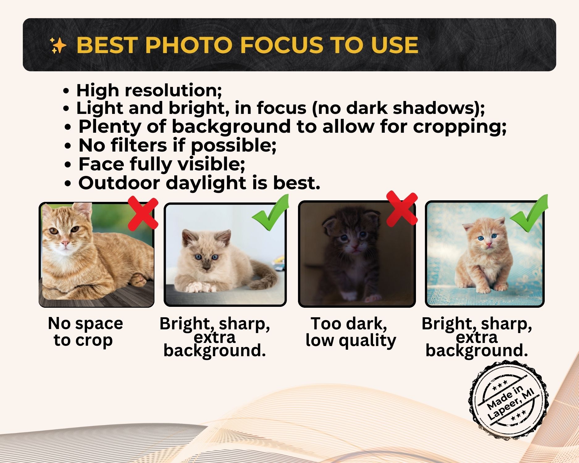 • Bright, sharp, high-resolution photos work best