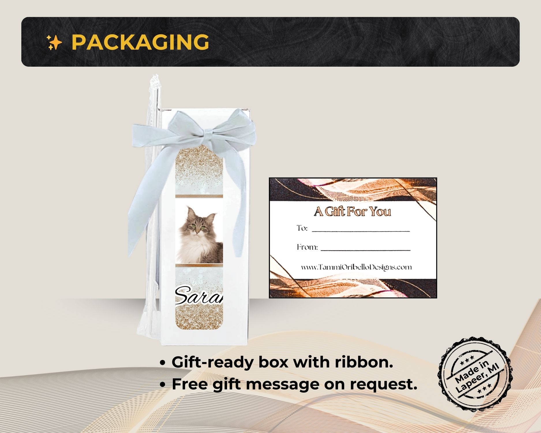 Each item is designed and created with care, then shipped from my studio in Lapeer, Michigan. Whether it’s a tumbler that celebrates a lifelong friendship, an ornament that remembers someone dearly missed, or a custom piece that captures a hobby, a pet, or a perfect moment—my goal is simple: To help you give a gift that becomes a memory all on its own.