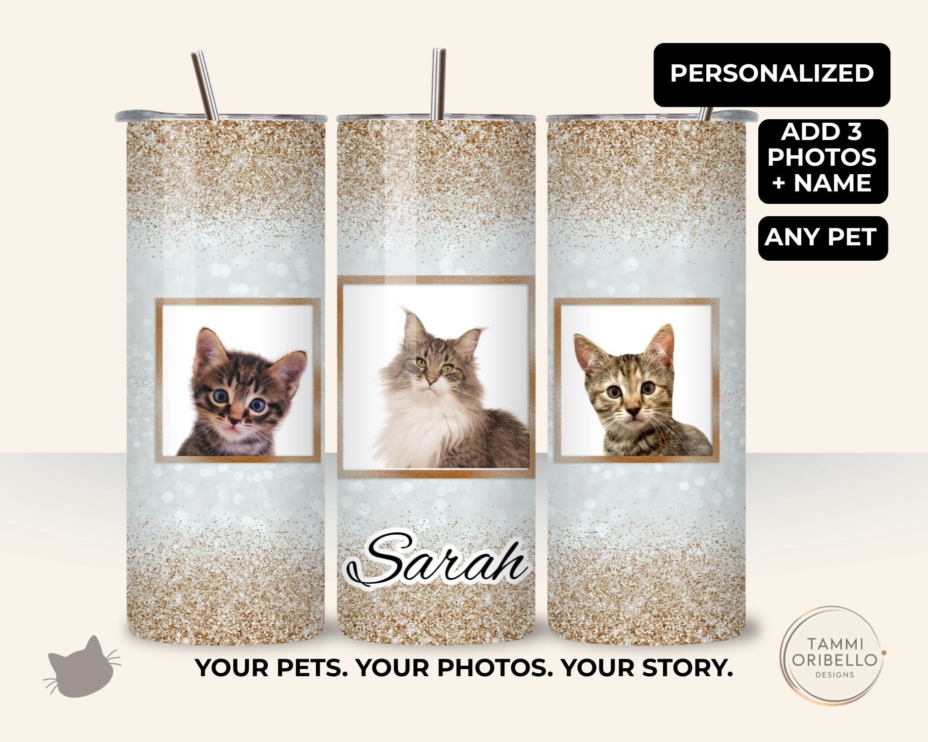 Personalized Cat Tumbler with Your Photos and Name, Custom Pet Portrait Gift, Glitter Cat Cup for Cat Lovers, Unique Pet Keepsake